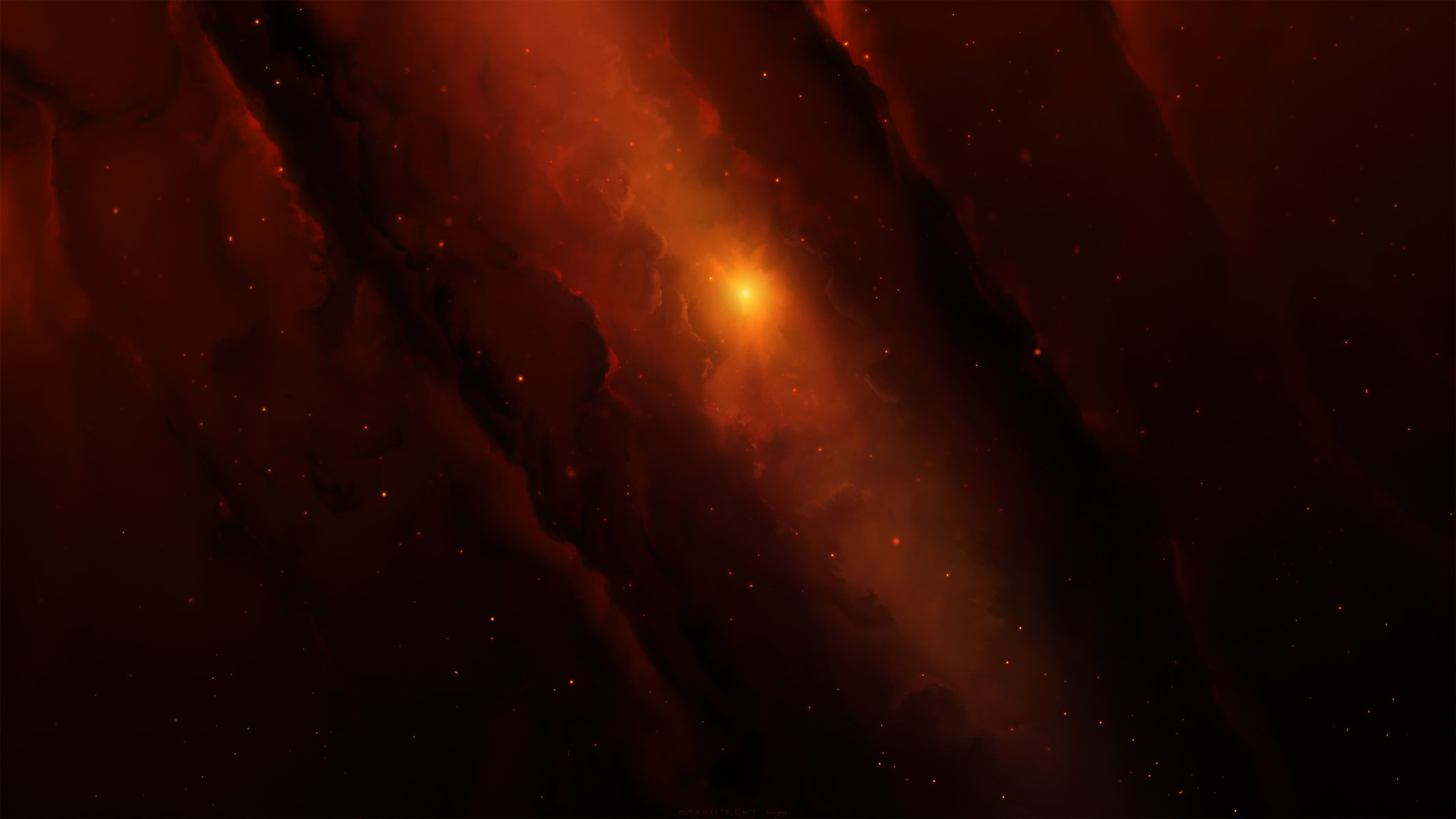 Lueur brumeuse orange dans un espace sombre et sans finLueur brumeuse orange dans un espace sombre et sans fin