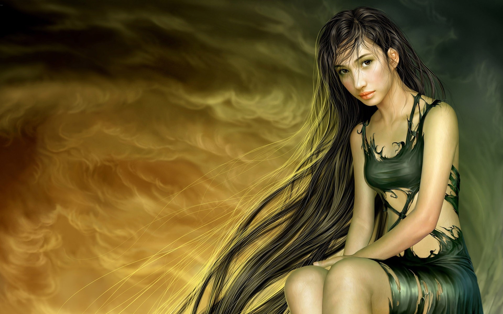 Fille triste avec de longs cheveux à la lueur du feuFille triste avec de longs cheveux à la lueur du feu