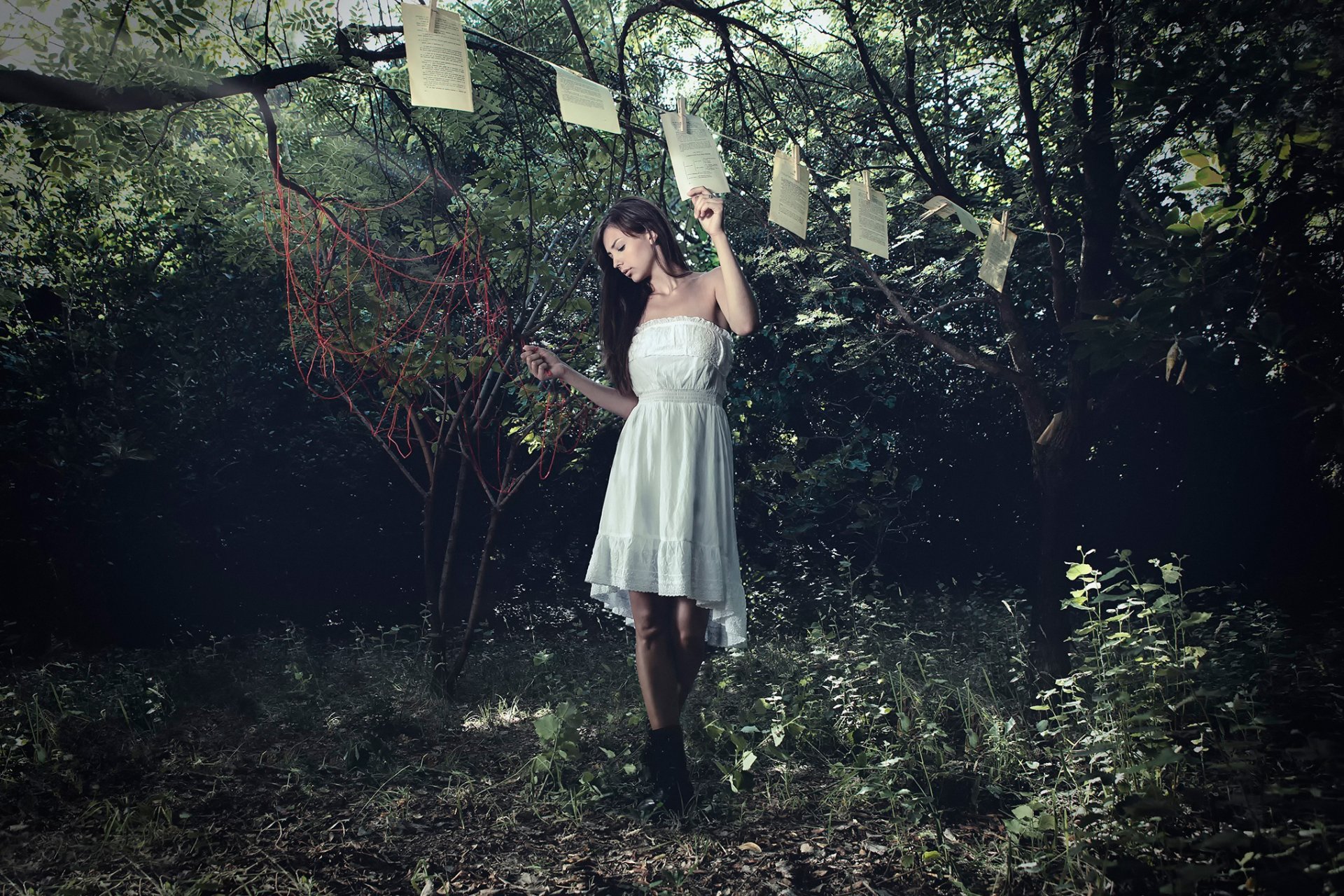 Fille en robe blanche s'accroche à une corde avec des pinces à linge feuilles de livre, tout se passe dans la forêtFille en robe blanche s'accroche à une corde avec des pinces à linge feuilles de livre, tout se passe dans la forêt