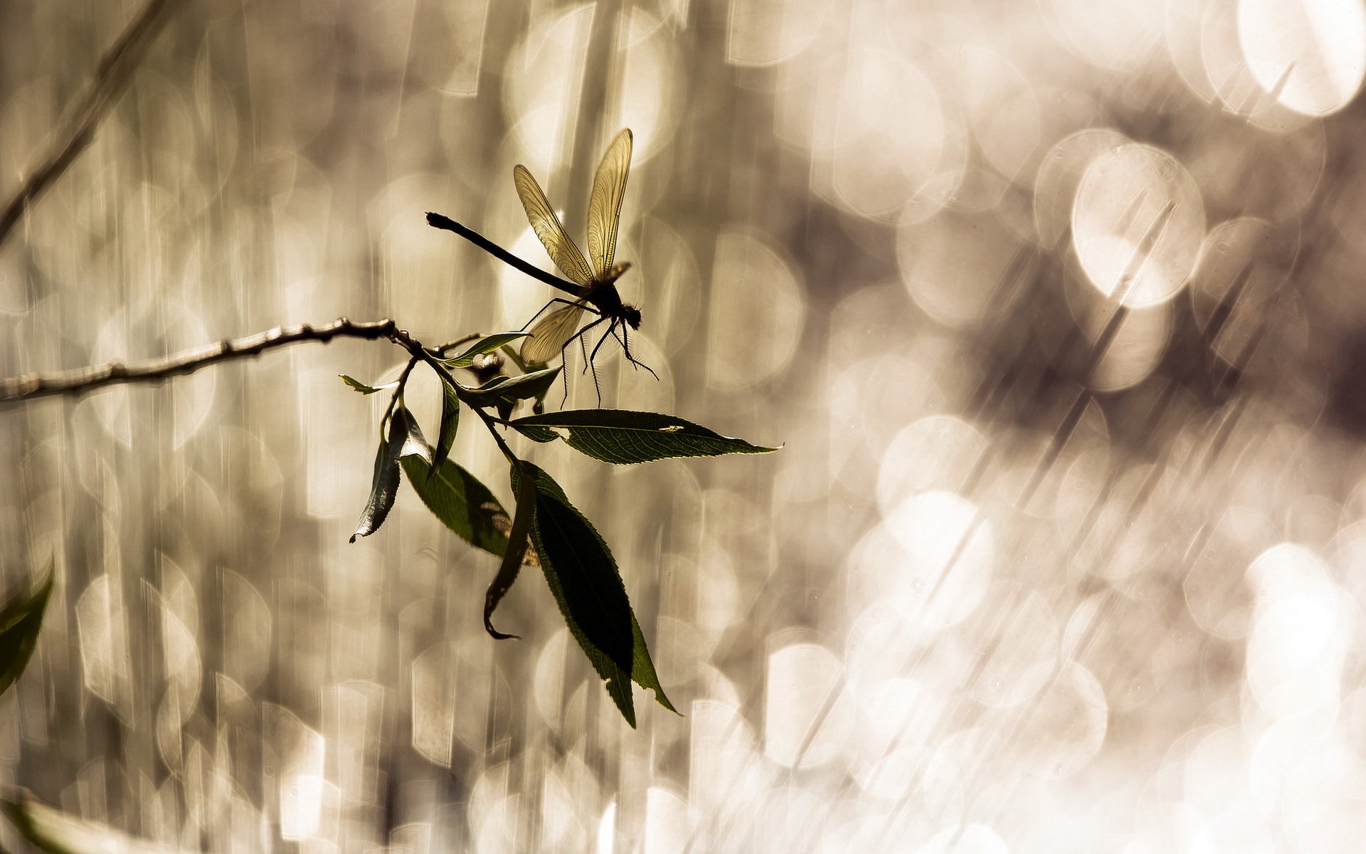 Libellule sur une branche avec des feuilles et des reflets du soleilLibellule sur une branche avec des feuilles et des reflets du soleil