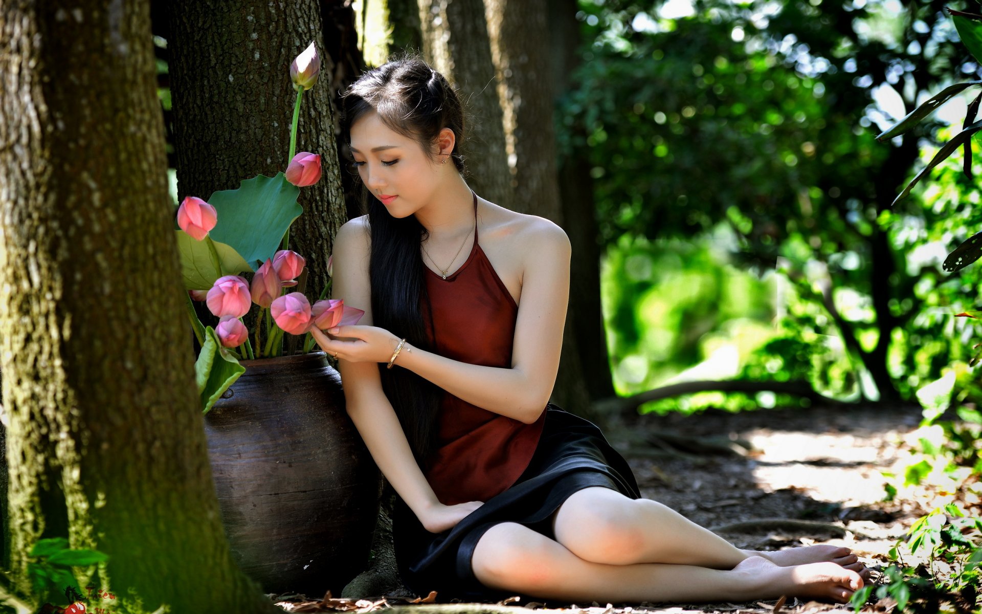 Belle fille asiatique se trouve dans un t-shirt érotique