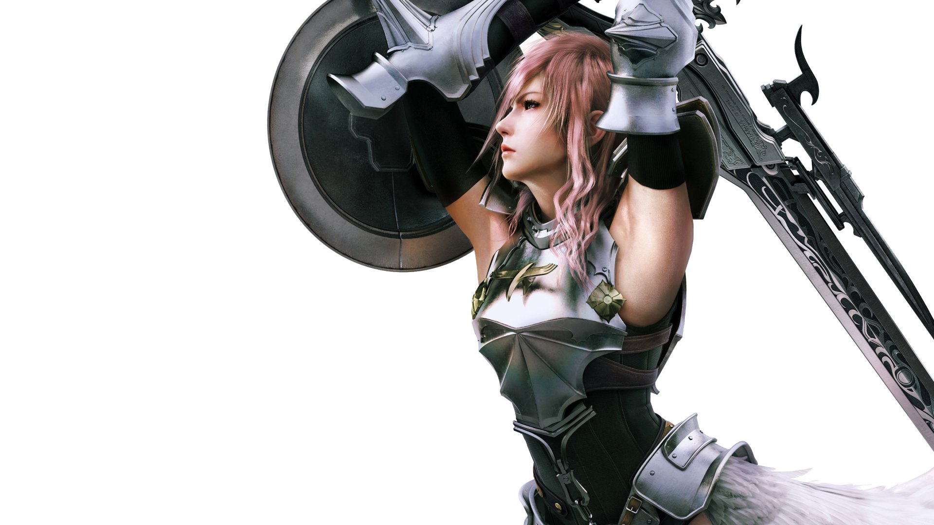 Fille avec bouclier et épée sur fond blanc
