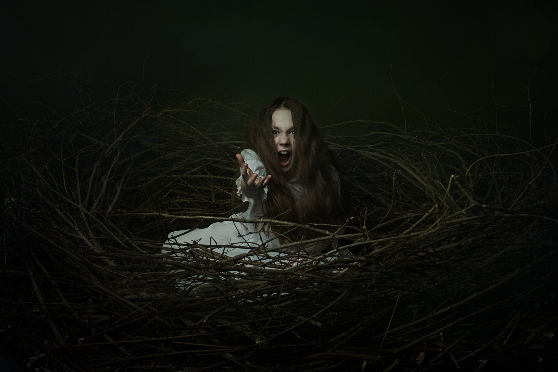 Alice aux yeux verts et aux cheveux noirs, regard fouAlice aux yeux verts et aux cheveux noirs, regard fou