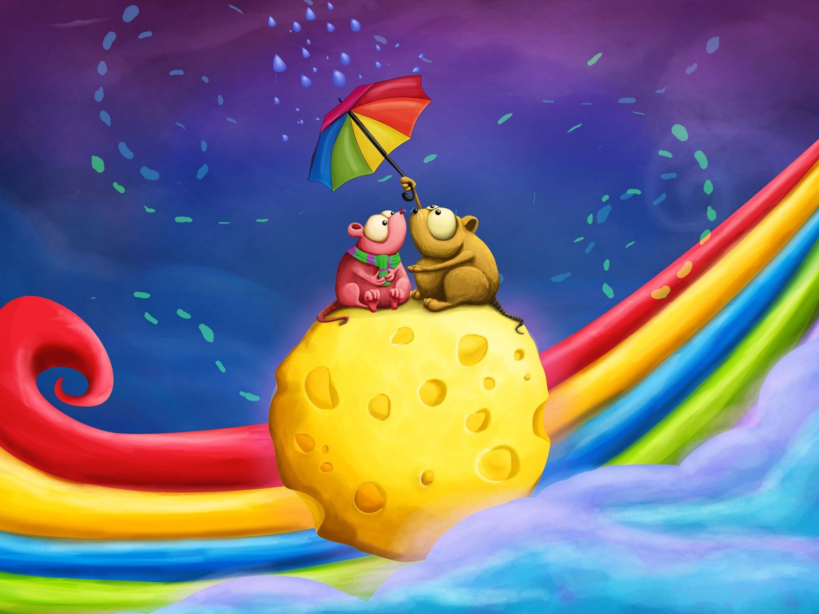 Deux souris sous un parapluie arc-en-ciel sur une boule de fromage