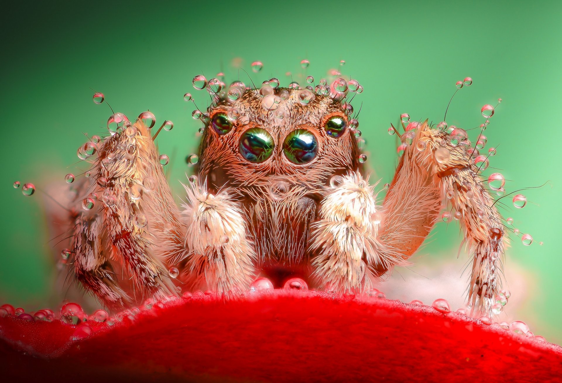 Araignée dans les gouttes de rosée sur une fleur rougeAraignée dans les gouttes de rosée sur une fleur rouge