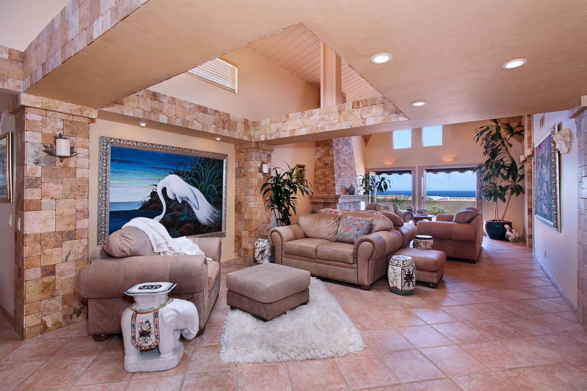 Grand salon de style moderne avec canapés en cuir et accès à la piscineGrand salon de style moderne avec canapés en cuir et accès à la piscine