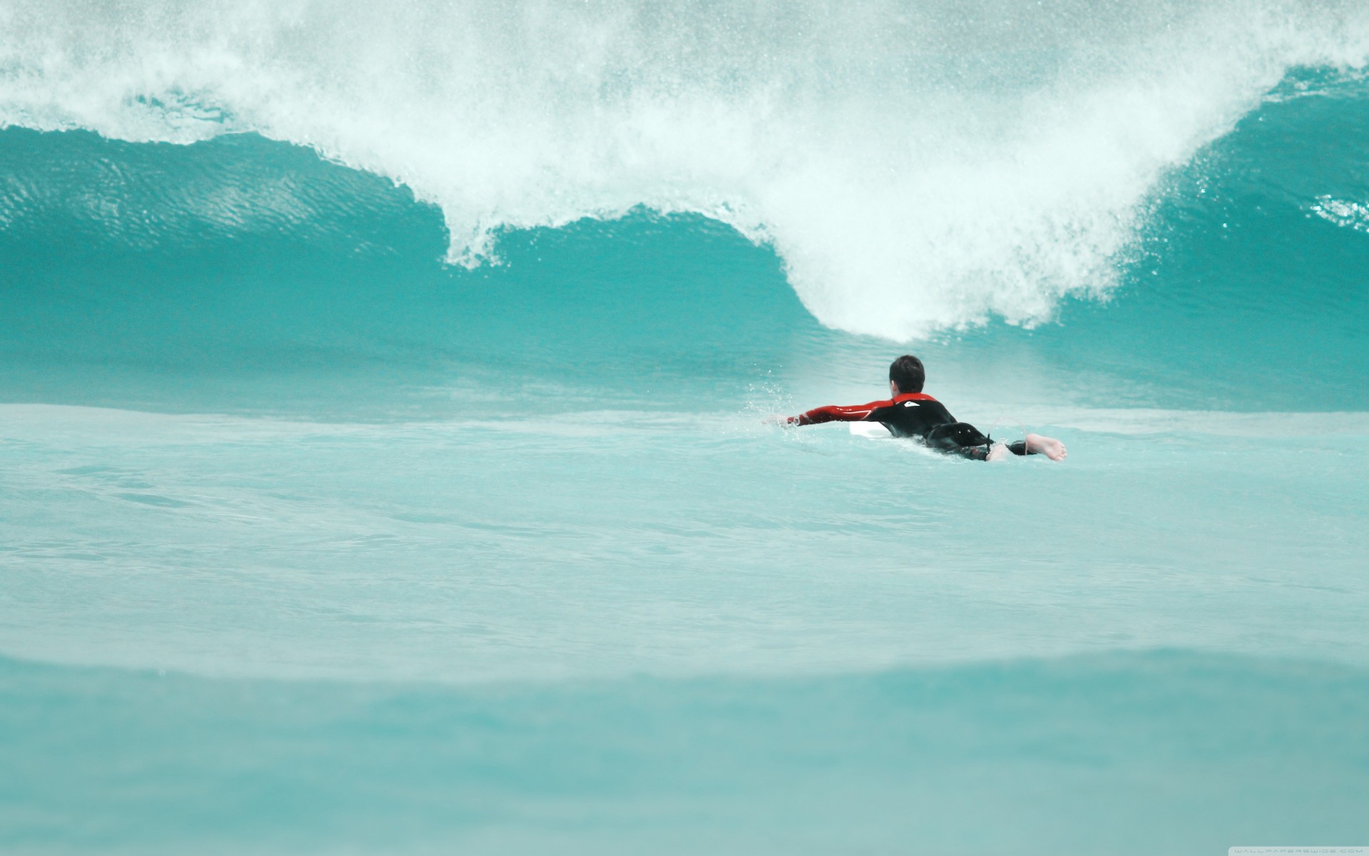 Homme sur une planche dans la crête d'une vague de merHomme sur une planche dans la crête d'une vague de mer