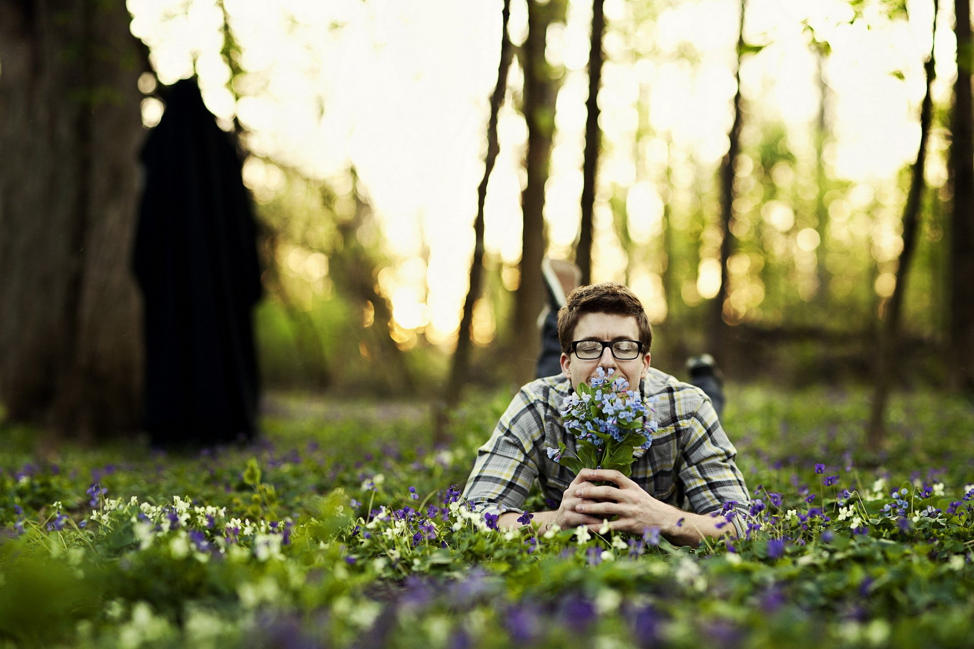 Guy se trouve sur l'herbe avec un bouquet de fleurs