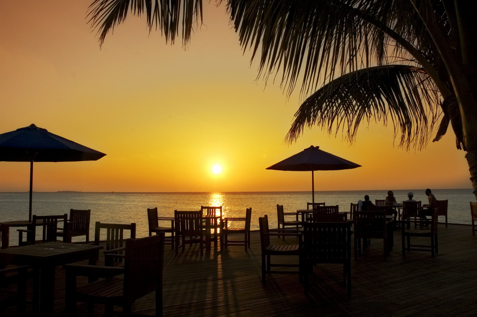 Les gens sont assis à une table à côté d'un palmier au coucher du soleilLes gens sont assis à une table à côté d'un palmier au coucher du soleil