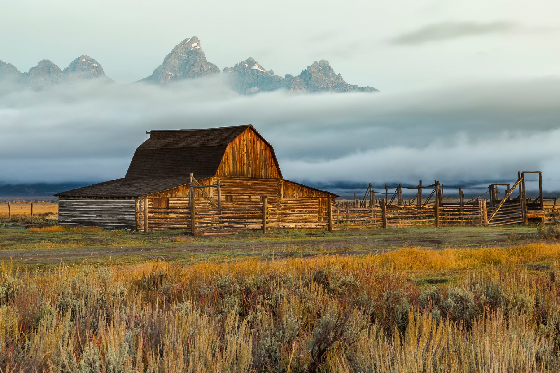 Ferme solitaire dans les montagnes sauvages enveloppées de brouillardFerme solitaire dans les montagnes sauvages enveloppées de brouillard