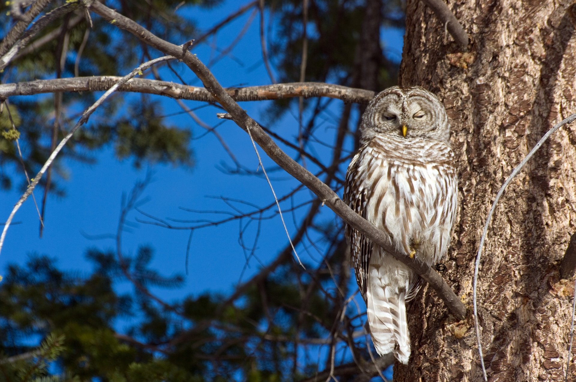 Hibou assis sur une branche d'arbre dans l'après-midiHibou assis sur une branche d'arbre dans l'après-midi