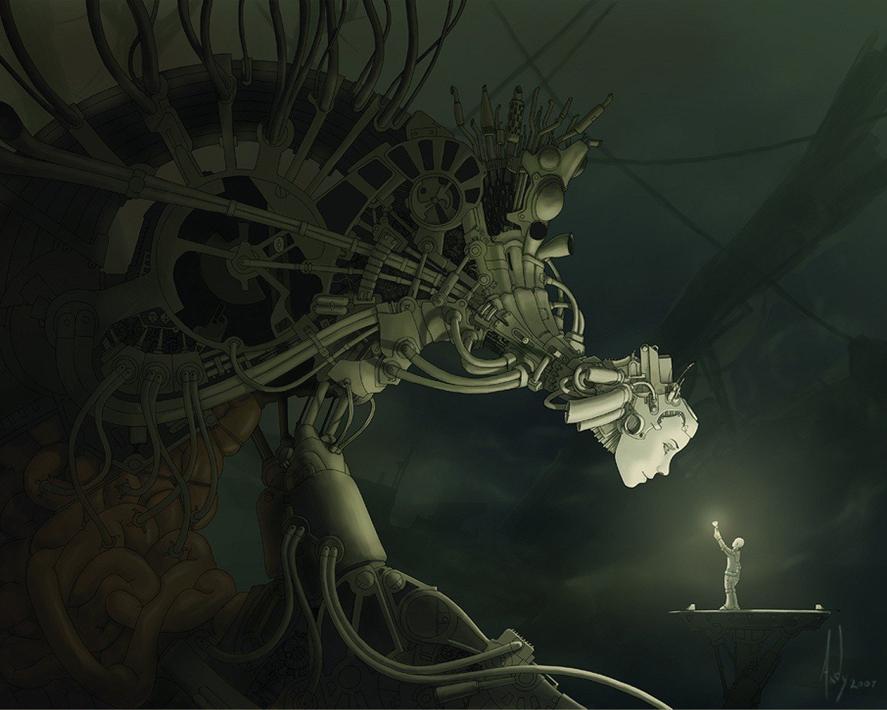 Énorme robot métallique et petit homme avec une torcheÉnorme robot métallique et petit homme avec une torche