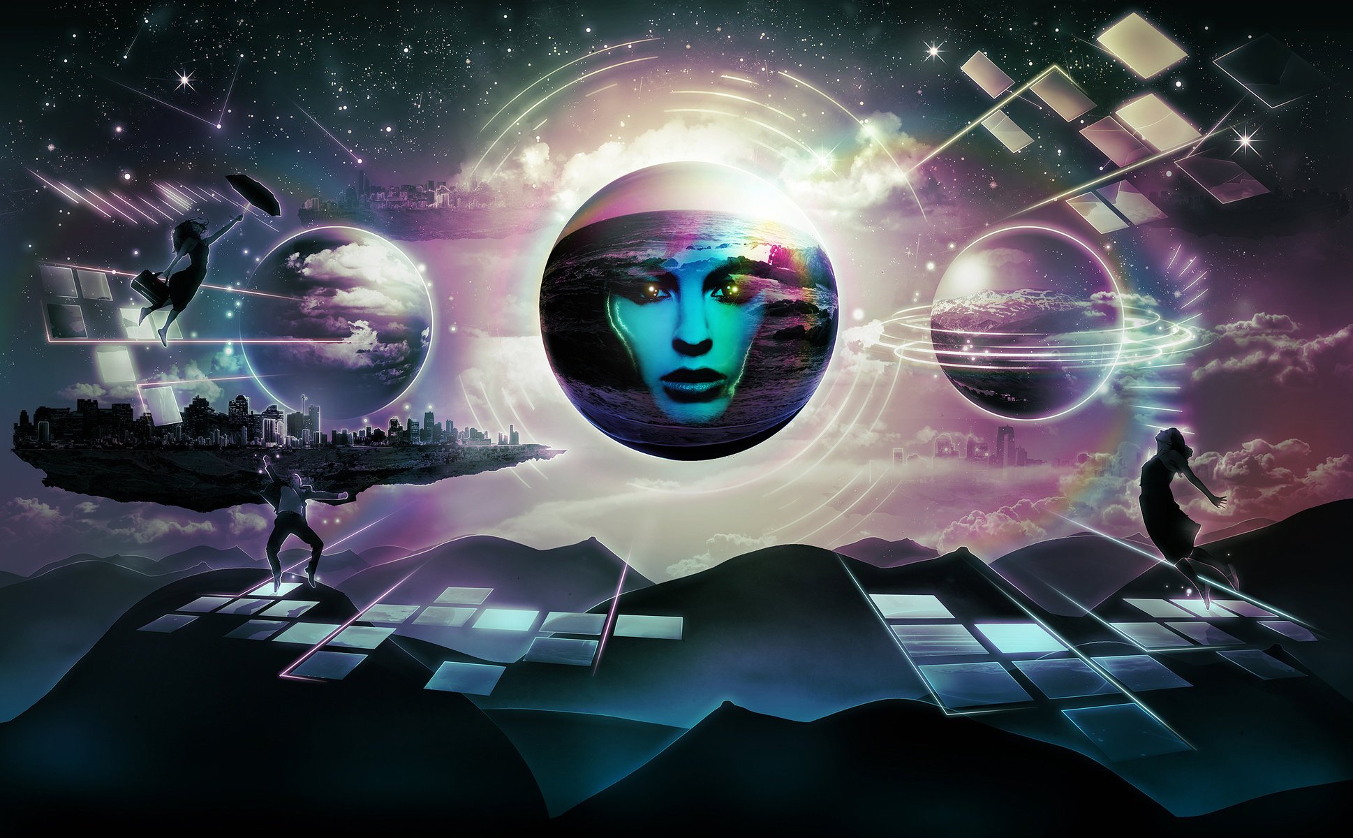 Dans l'espace cyberpunk ville planète avec le visage d'une femmeDans l'espace cyberpunk ville planète avec le visage d'une femme