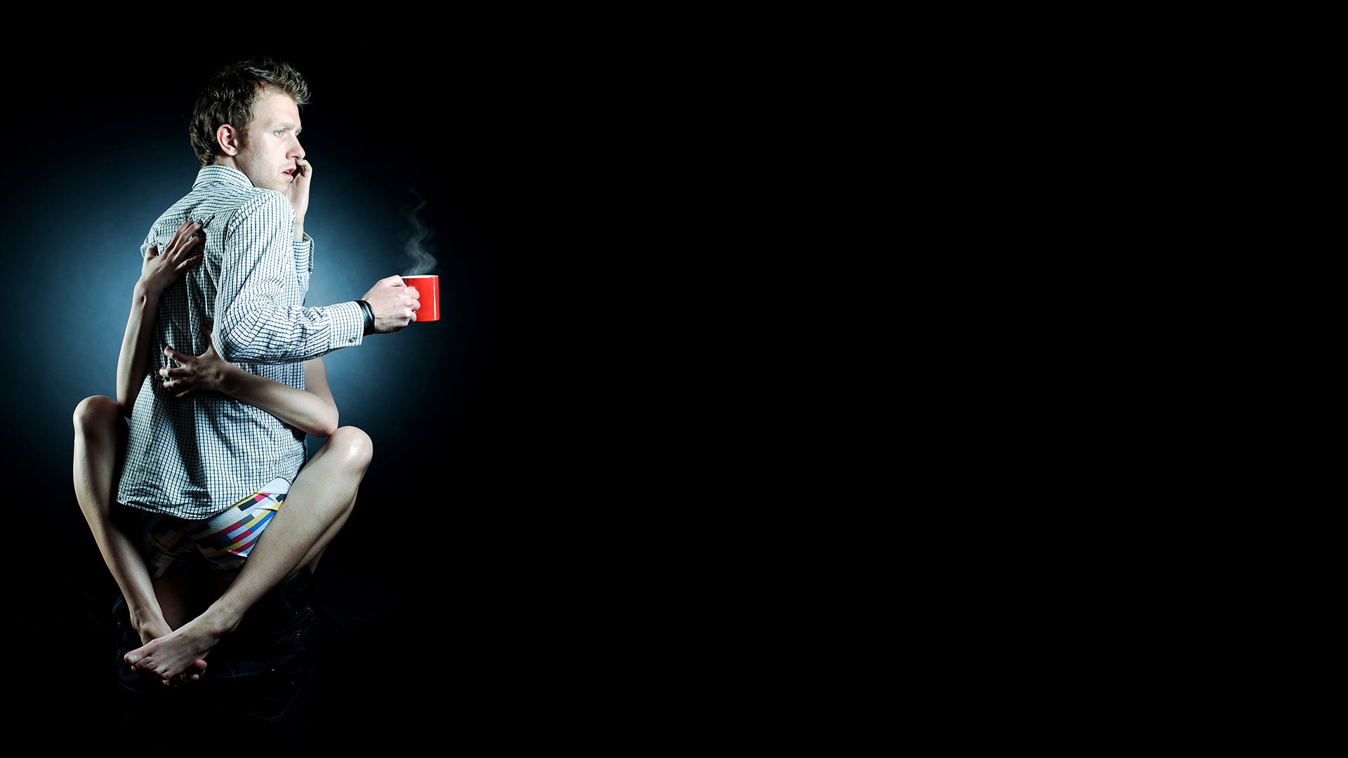 Homme avec téléphone et café dans les bras d'une femmeHomme avec téléphone et café dans les bras d'une femme