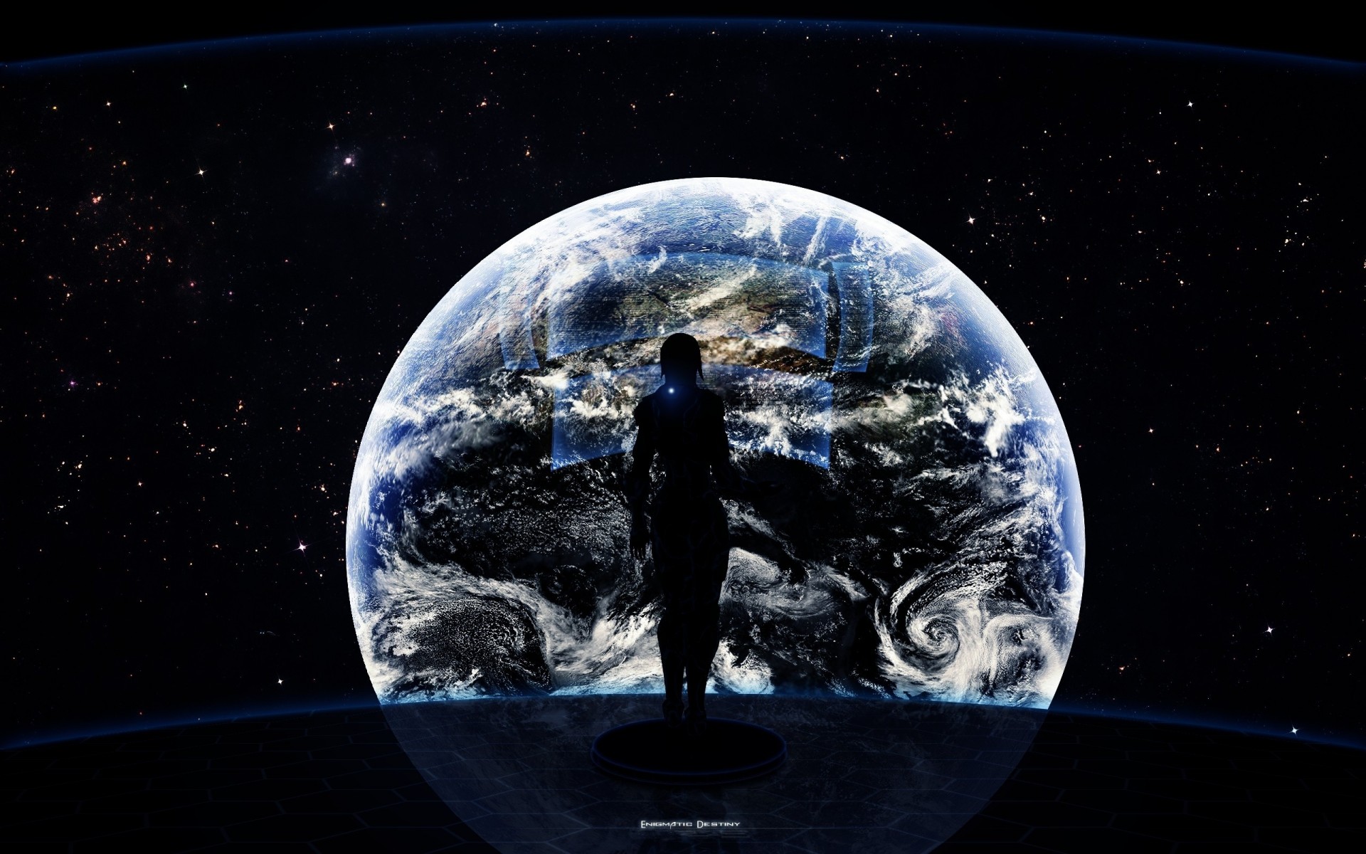 Un homme regarde par la fenêtre d'un navire sur une planète dans l'espaceUn homme regarde par la fenêtre d'un navire sur une planète dans l'espace
