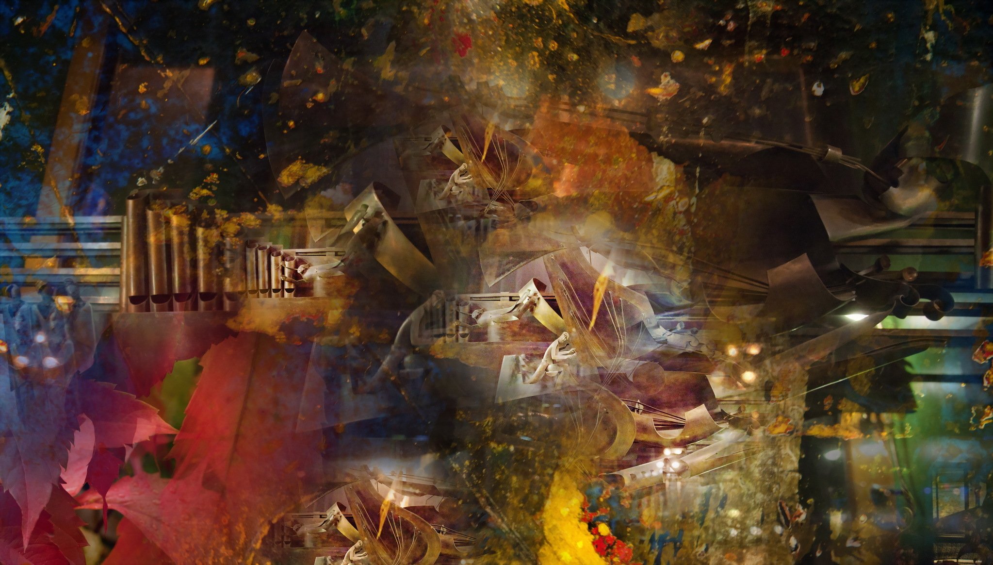Une représentation abstraite et colorée des instruments de musique et pas seulement