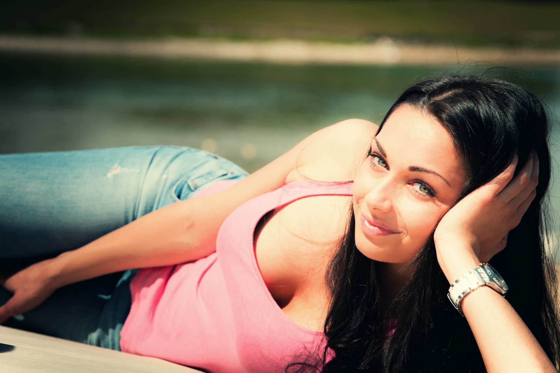 La jeune fille est allongée sur le côté dans un Jean bleu et un t-shirt rose