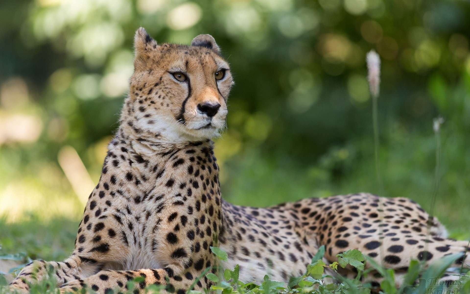 Assise la jeune fille et le guépard regardent les uns les autres dans les yeuxAssise la jeune fille et le guépard regardent les uns les autres dans les yeux