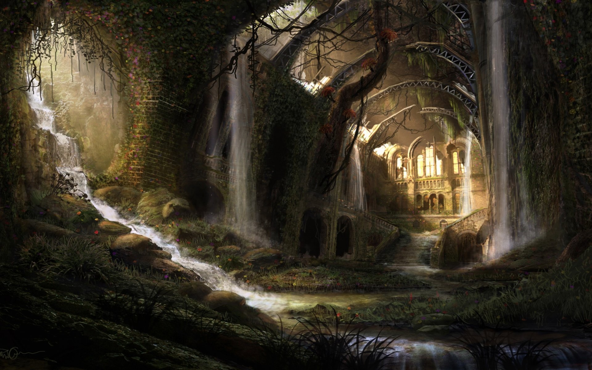 Fourrés d'arbres. Cascade dans la grotte