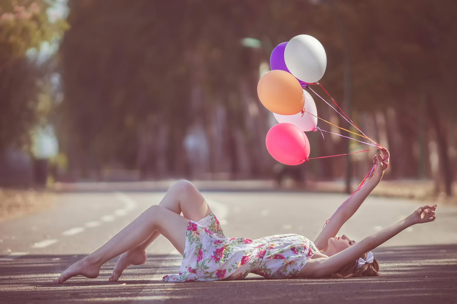 La jeune fille sur la route se trouve avec des boulesLa jeune fille sur la route se trouve avec des boules