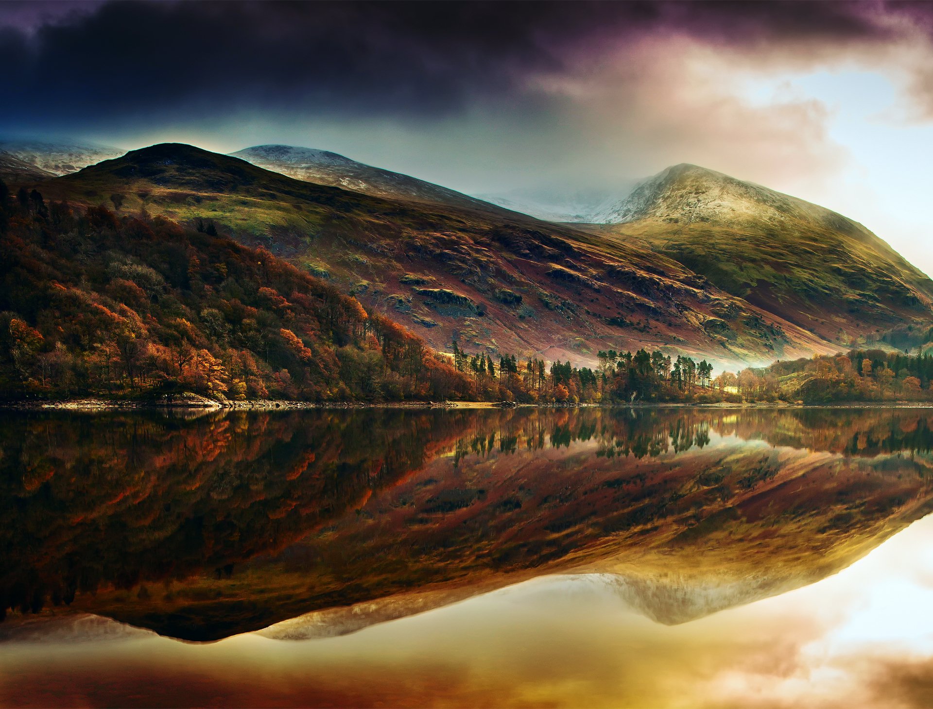 Coucher du soleil. reflet des collines dans la surface du lacCoucher du soleil. Reflet des collines dans la surface du lac
