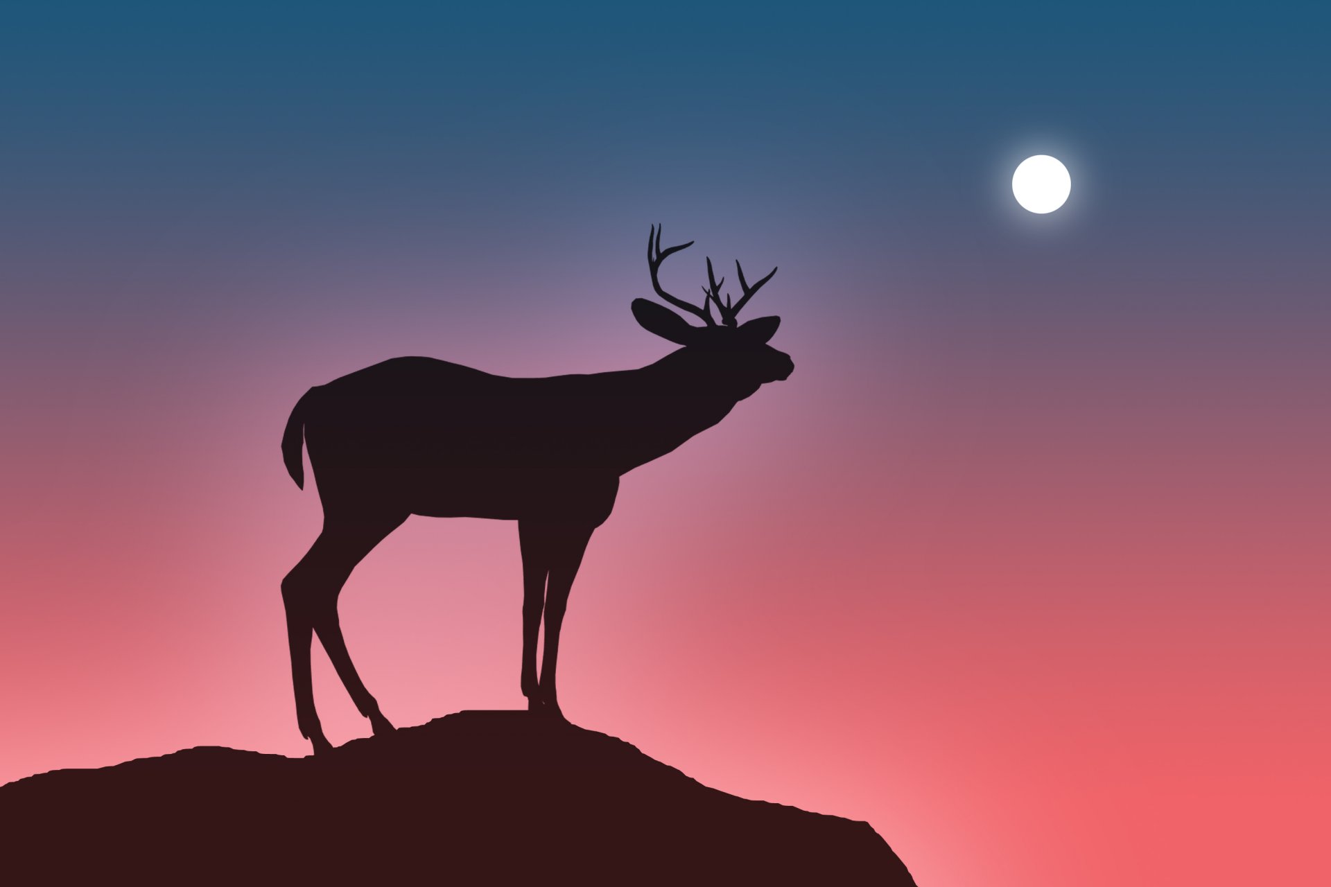 Image-minimalisme, cerf solitaire regardant la lune au coucher du soleil rose vifImage-minimalisme, cerf solitaire regardant la lune au coucher du soleil rose vif