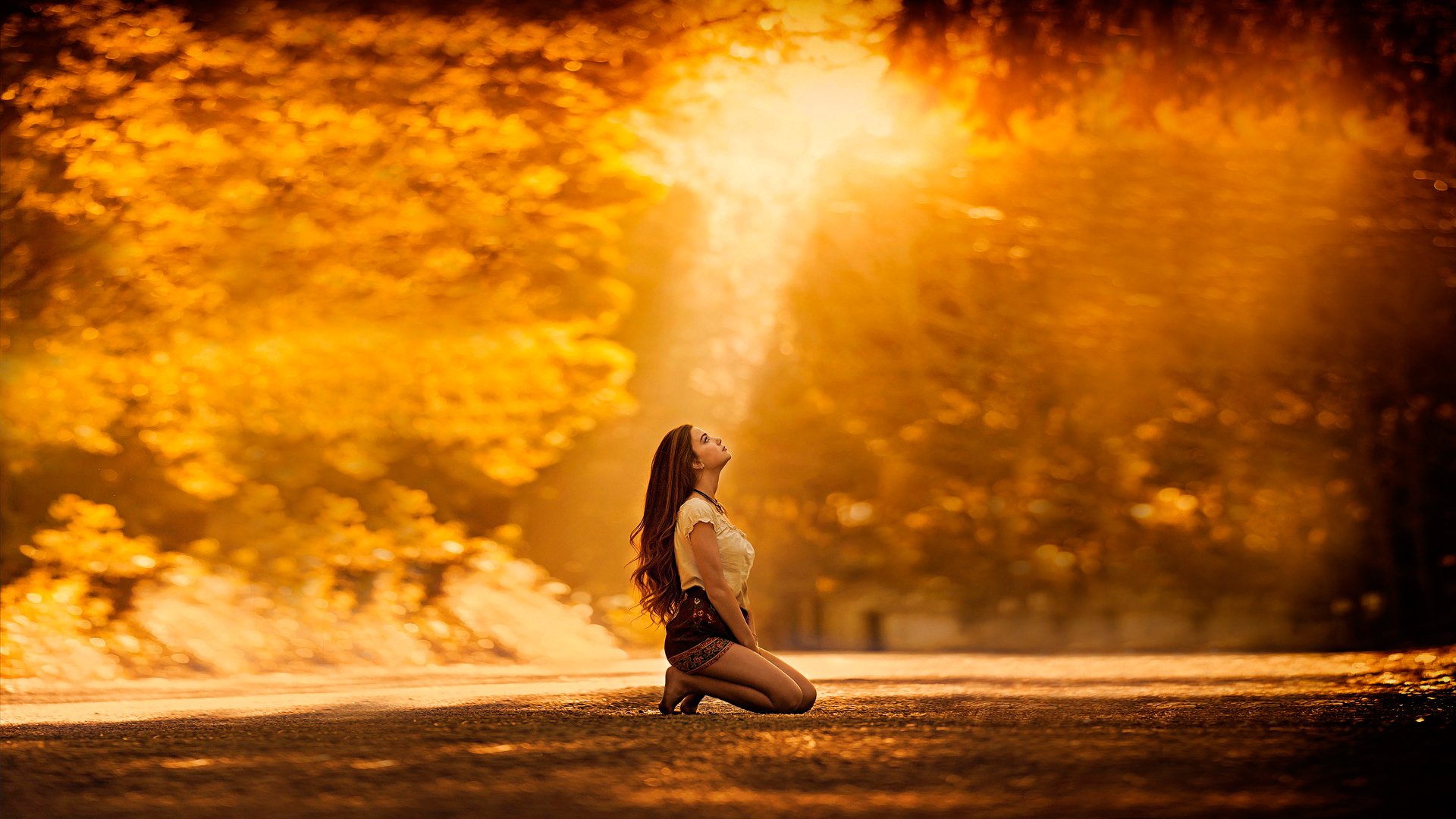 La silhouette de la jeune fille sur le coucher du soleil du soir