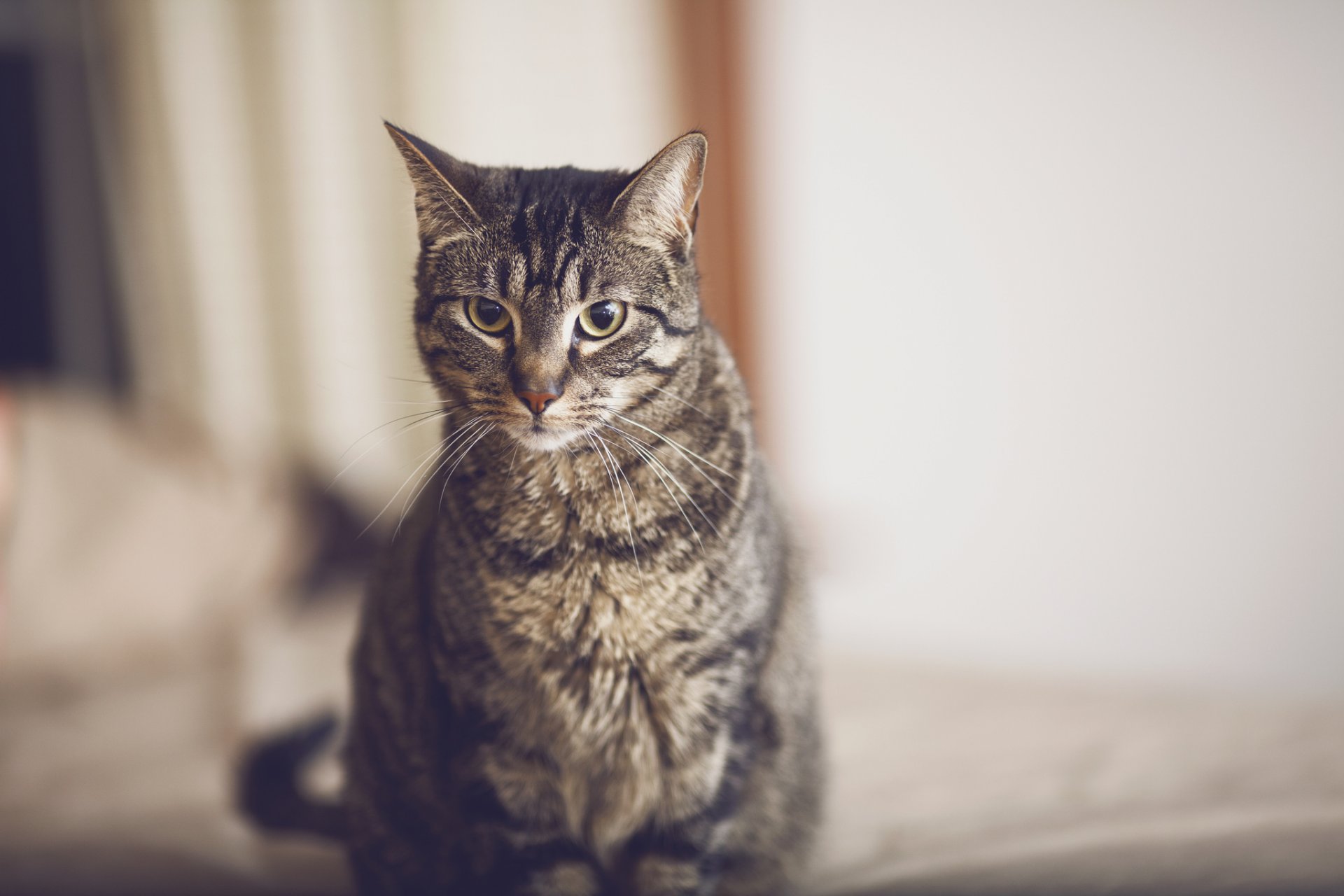 Chat sur la balustrade. Le chat a des pattes grises et une queue rayée