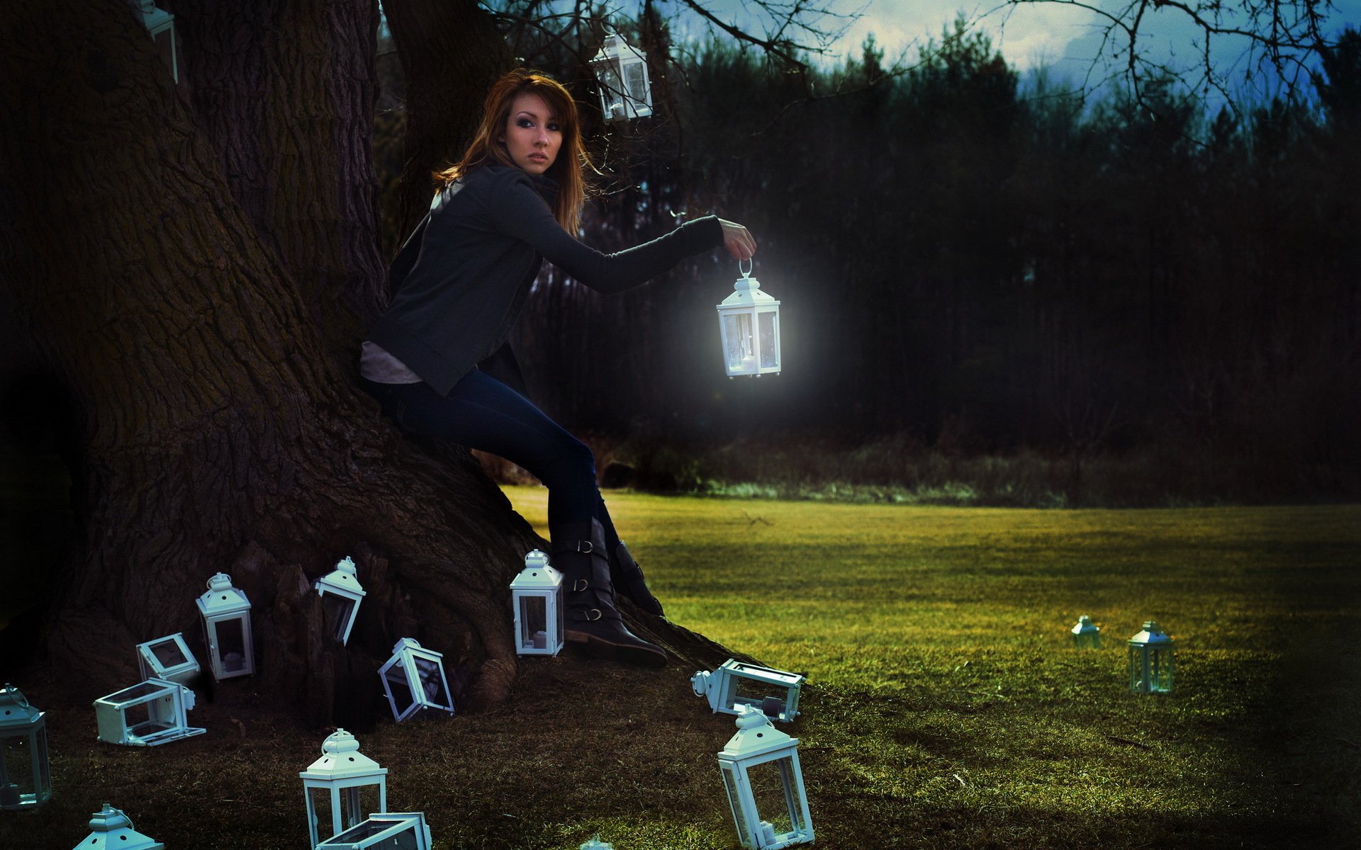 Fille près de l'arbre dans la nuit avec des lanternes