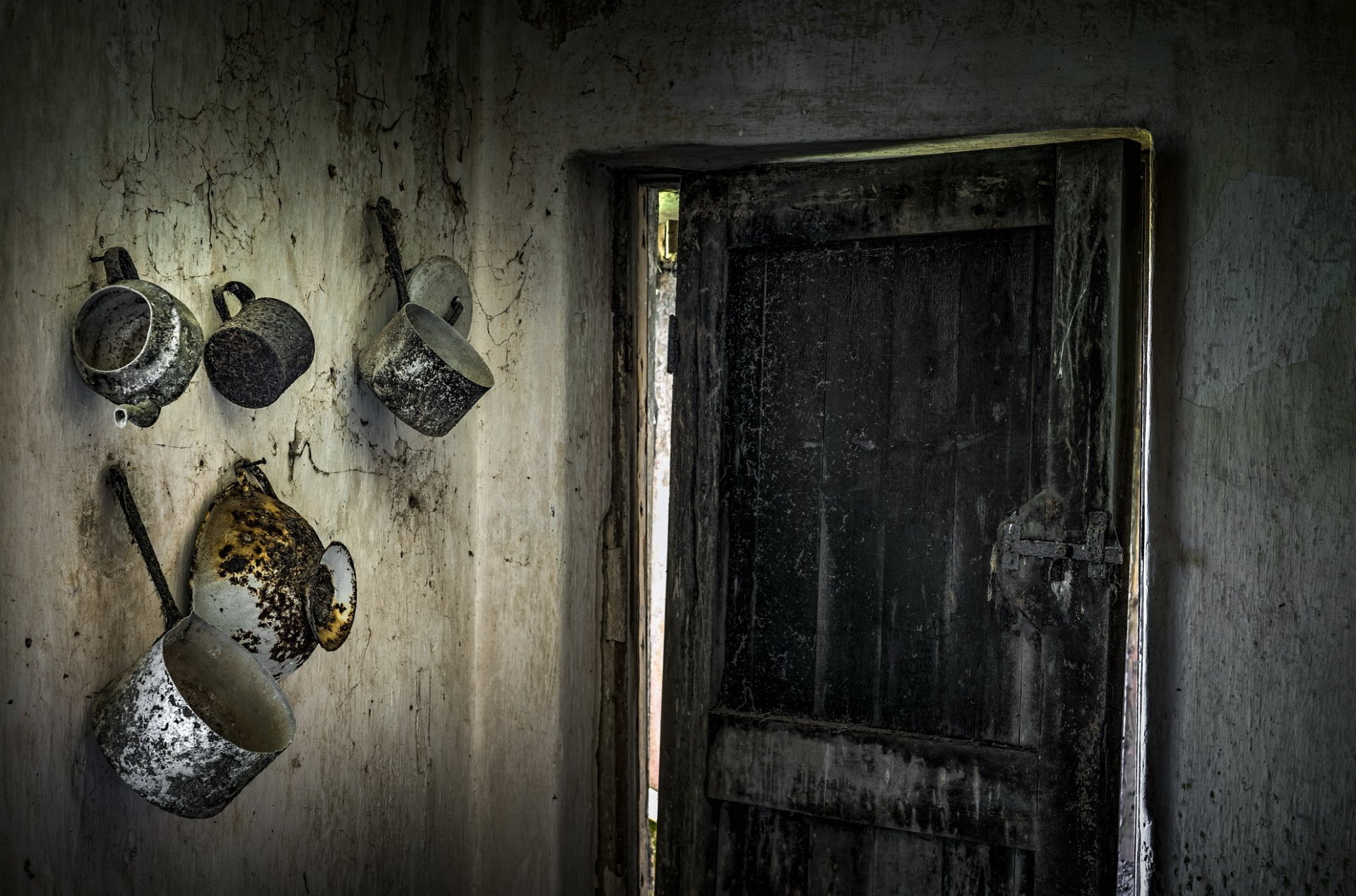 Vieille porte dans la chambre avec de la vaisselle sale sur le murVieille porte dans la chambre avec de la vaisselle sale sur le mur