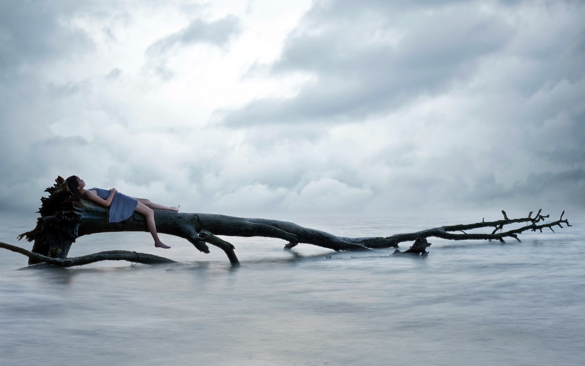 La fille sur le поваленом noir l'arbre au milieu de la merLa fille sur le поваленом noir l'arbre au milieu de la mer