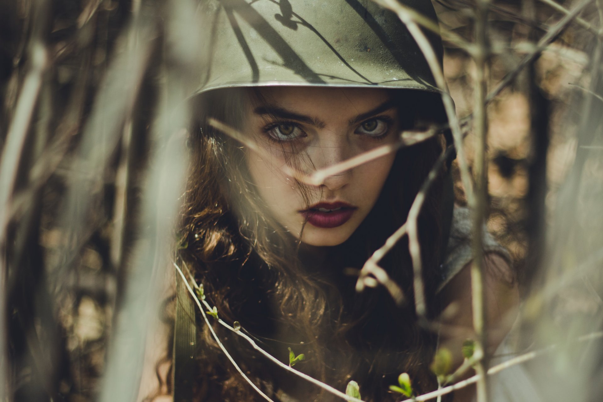 À travers les branches de la jeune fille dans le casqueÀ travers les branches de la jeune fille dans le casque