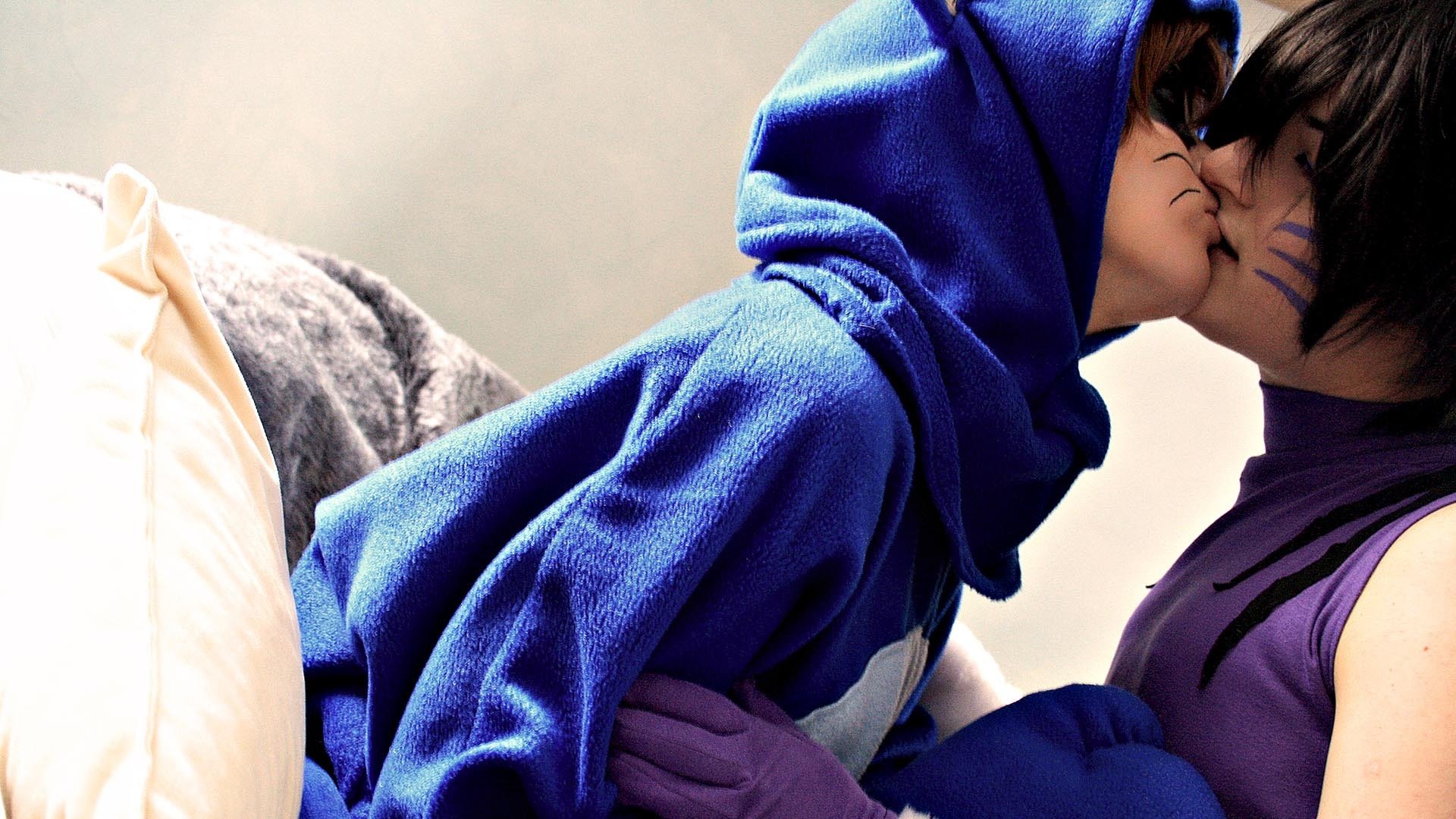 Le gars et la fille avec нарисованеыми moustache s'embrassent