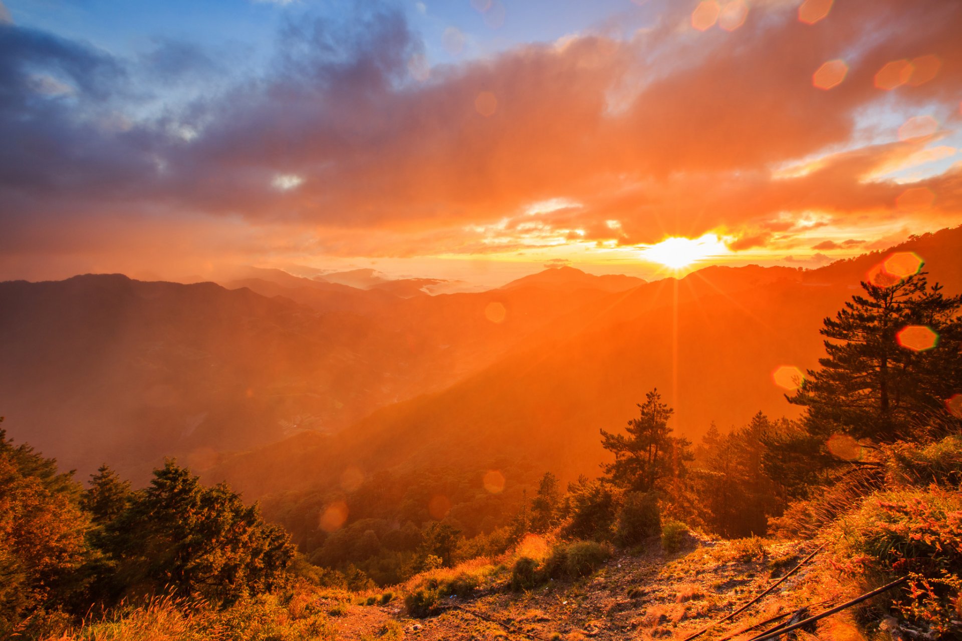 Clairière verte dans les montagnes sur fond de coucher de soleilClairière verte dans les montagnes sur fond de coucher de soleil