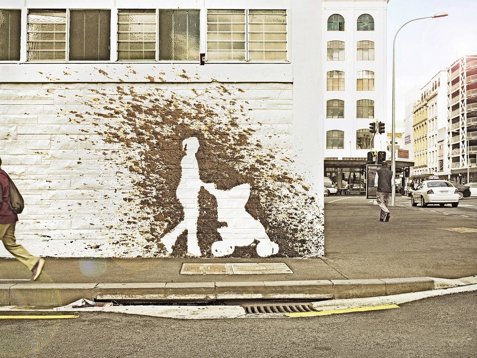 Fille dans une robe rouge à pois et avec un parapluie rouge est assis sur le trottoir à côté de voitures rétro sur le fond de la maisonFille dans une robe rouge à pois et avec un parapluie rouge est assis sur le trottoir à côté de voitures rétro sur le fond de la maison