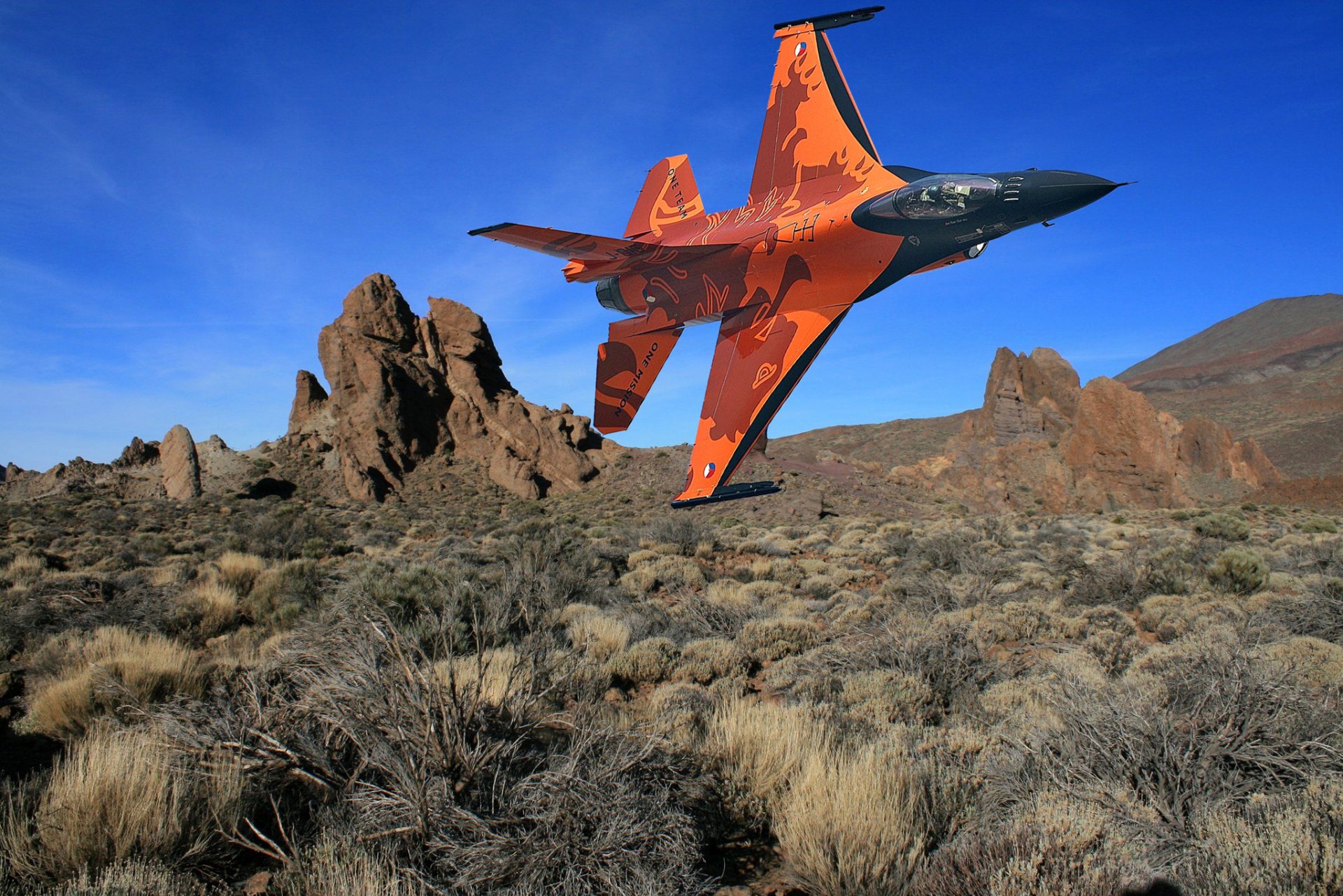 Un chasseur orange au-dessus des collines entre dans un virageUn chasseur orange au-dessus des collines entre dans un virage