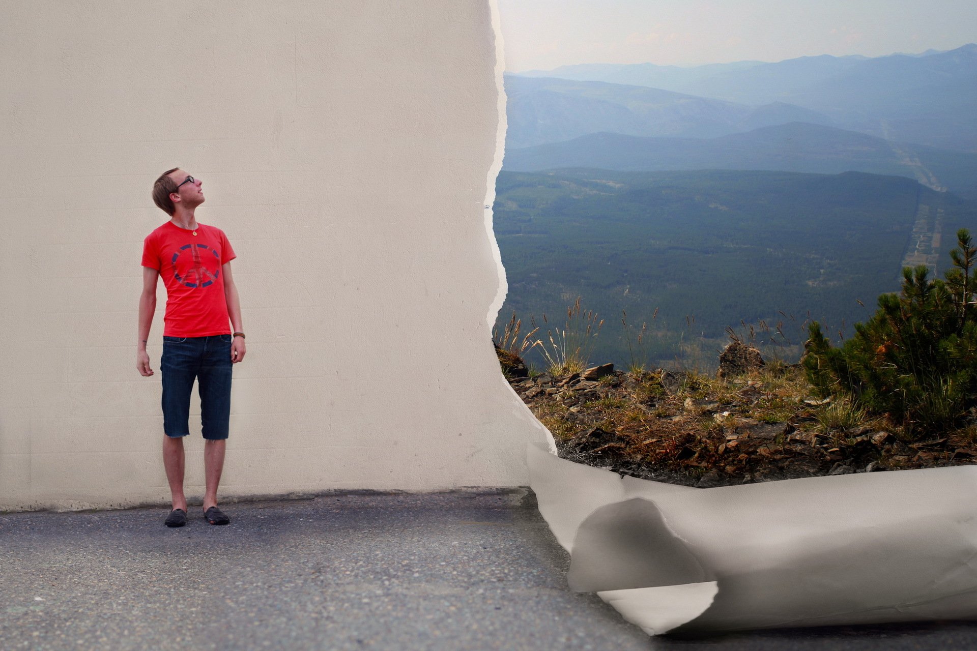 Un gars en t-shirt rouge regarde le ciel près d'un mur blancUn gars en t-shirt rouge regarde le ciel près d'un mur blanc