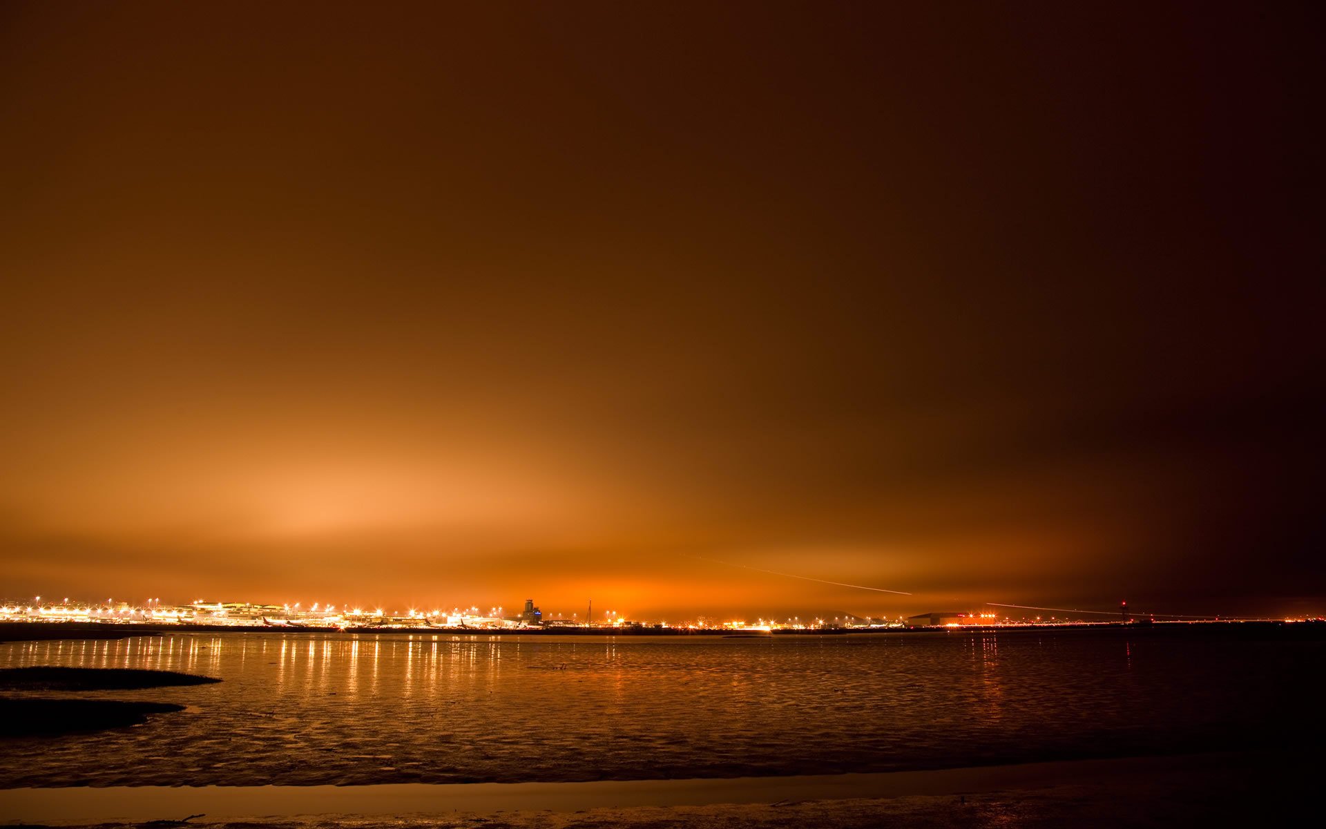 La mer illuminée par les lumières de la ville du soirLa mer illuminée par les lumières de la ville du soir