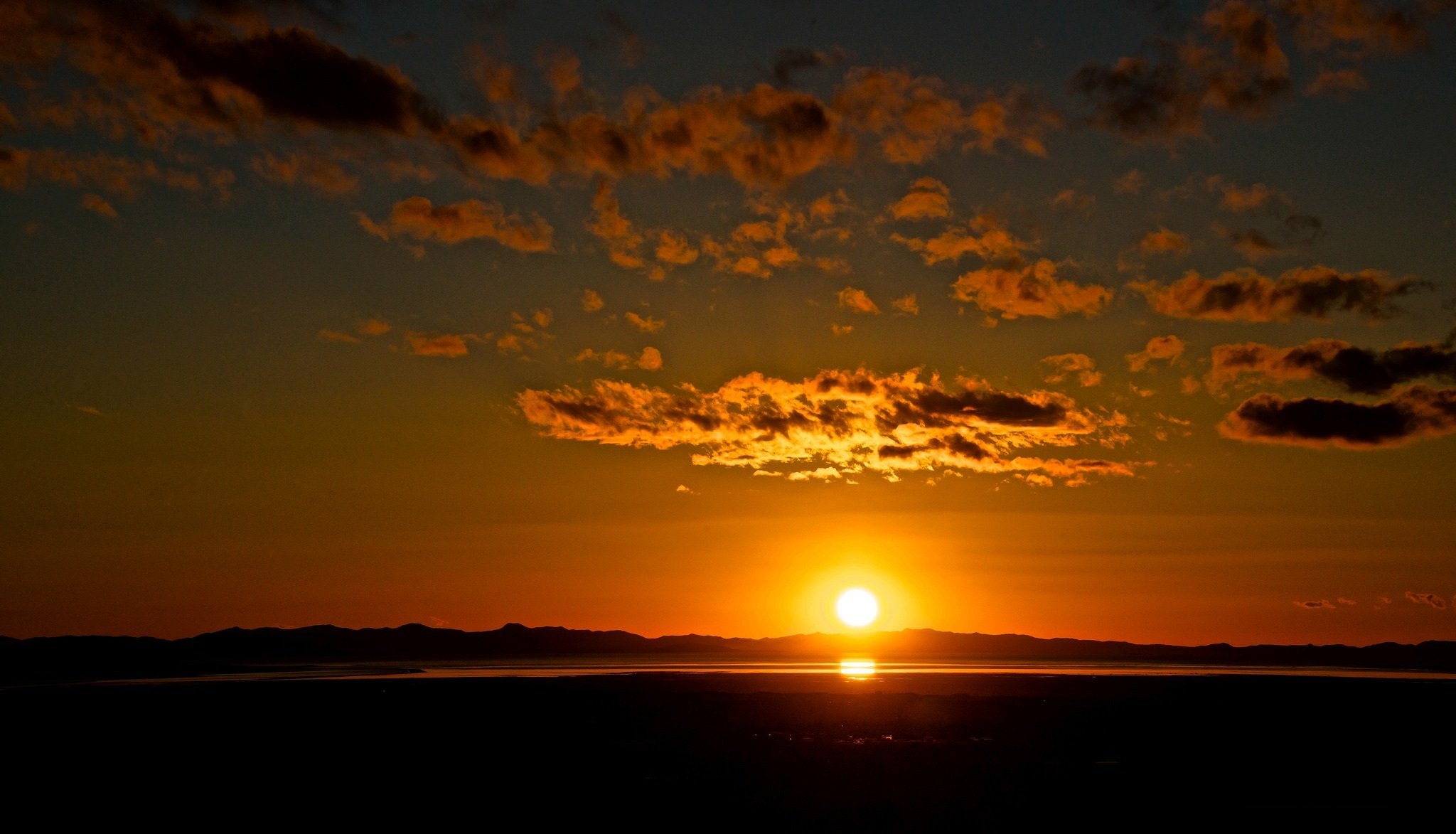 Coucher de soleil au bord du lac. nuages, coucher de soleil orange