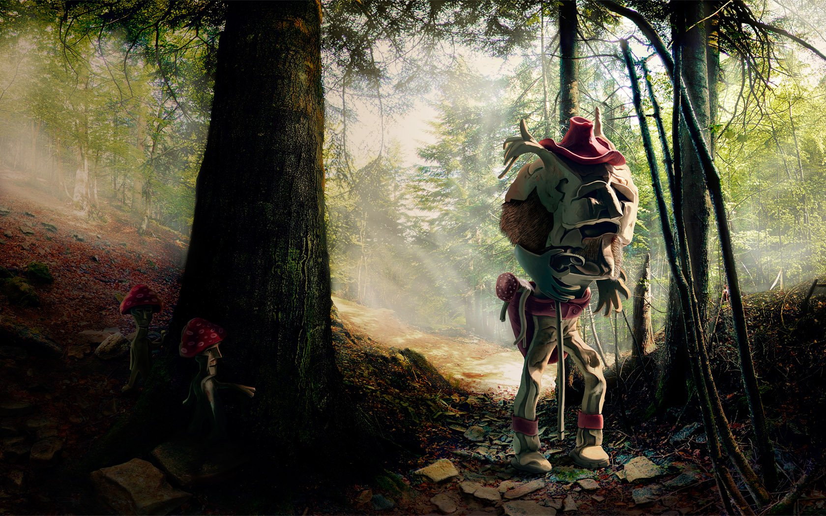 Monstre dans la forêt brumeuse avec des champignonsMonstre dans la forêt brumeuse avec des champignons