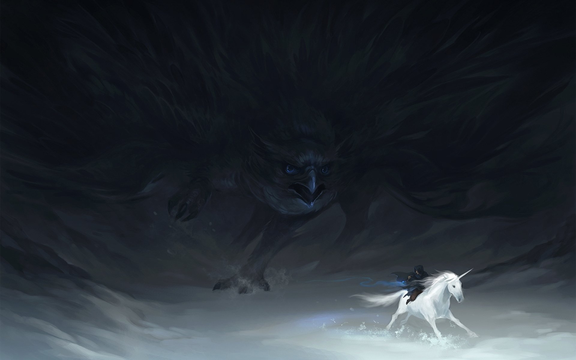 Le cavalier se cache des bras des ténèbres sur la licorneLe cavalier se cache des bras des ténèbres sur la licorne