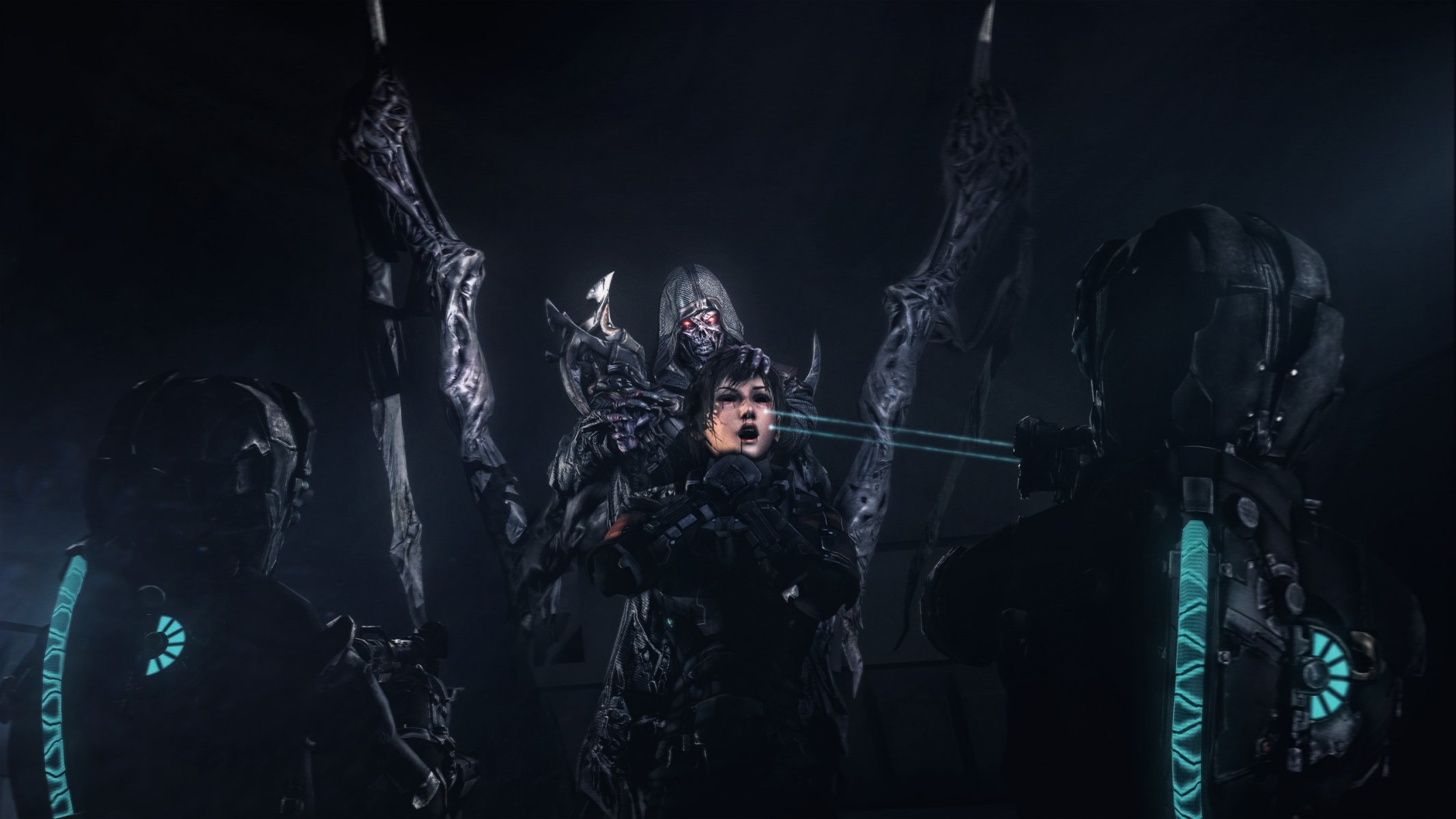 Un groupe de rock se dresse sur le fond d'un monstre à dentsUn groupe de Rock se dresse sur le fond d'un monstre à dents