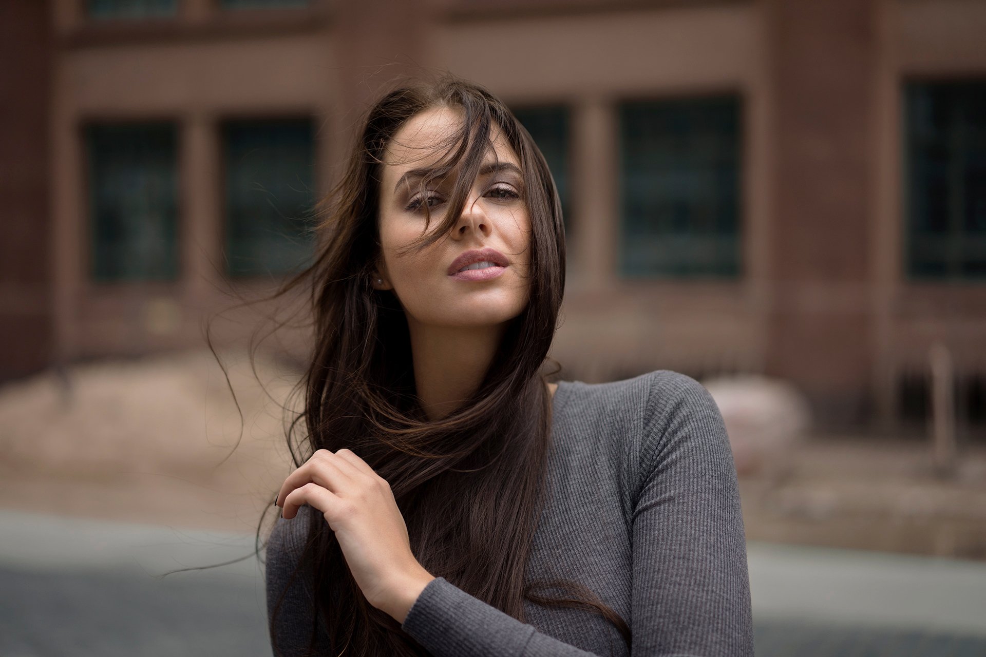 Jeune fille posant dans le vent sur le fond du bâtiment