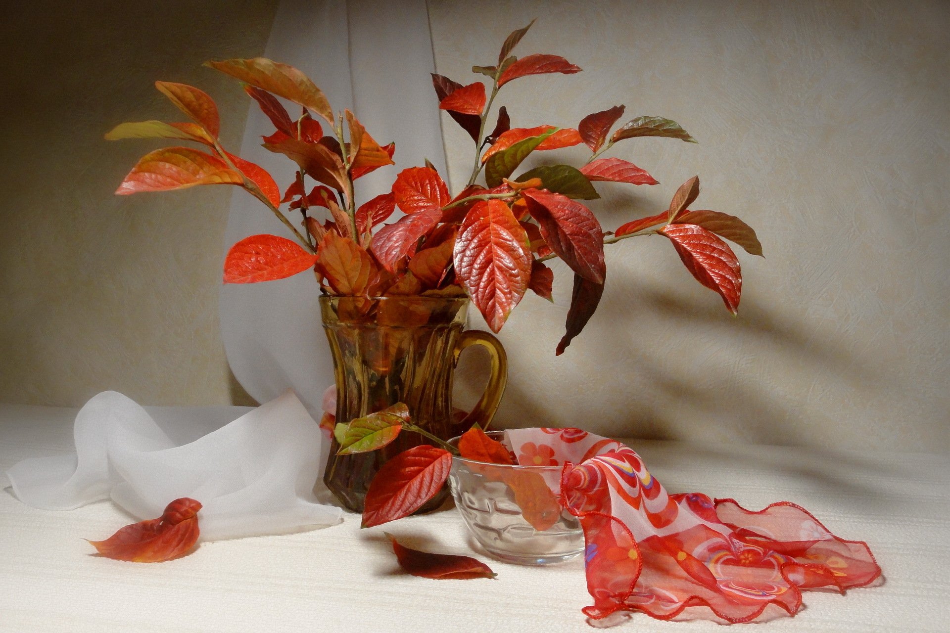 Nature morte avec des feuilles d'automne et des tomates mûresNature morte avec des feuilles d'automne et des tomates mûres