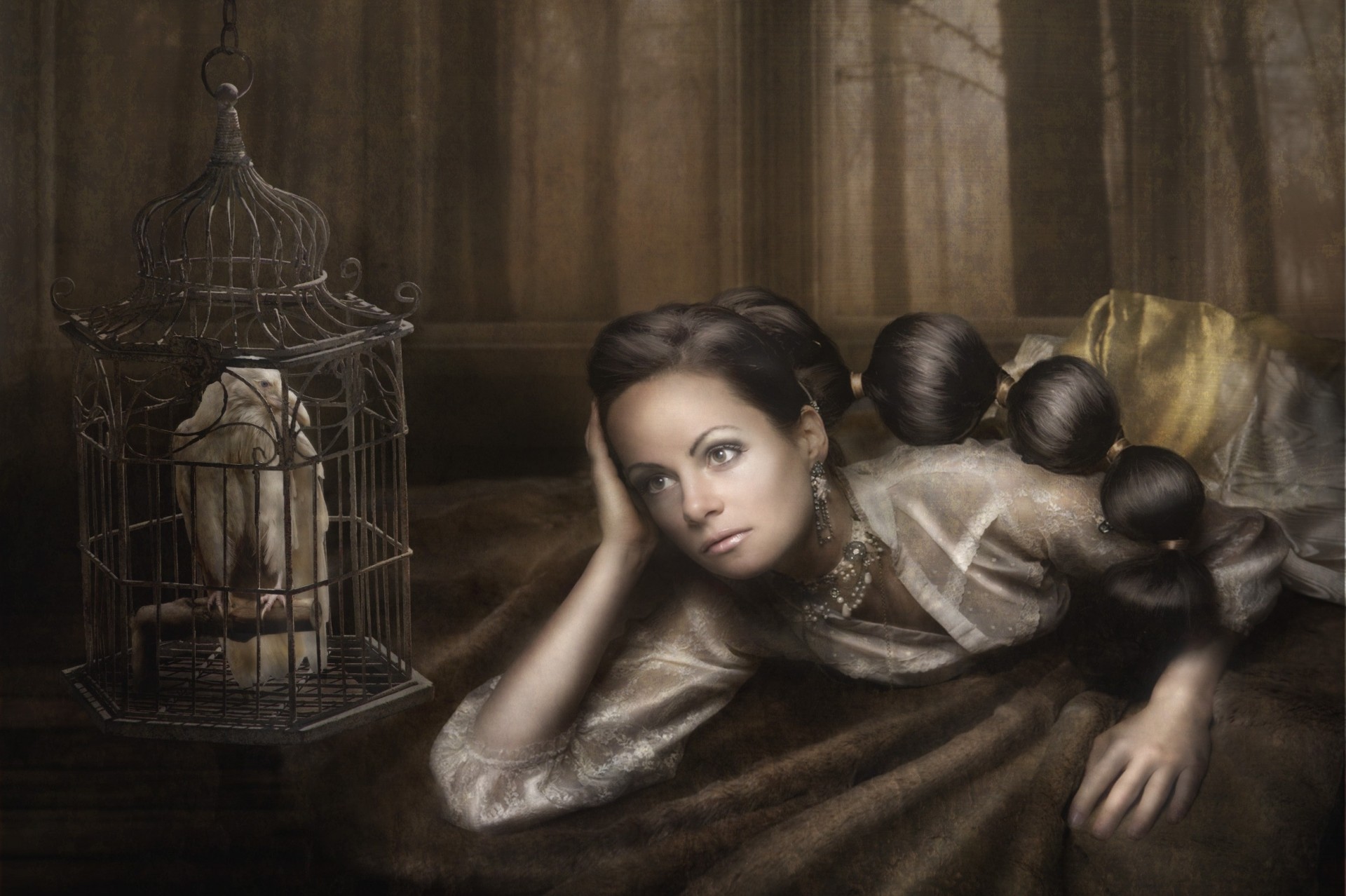 Fille à l'extérieur de la fenêtre avec un oiseau dans une cageFille à l'extérieur de la fenêtre avec un oiseau dans une cage