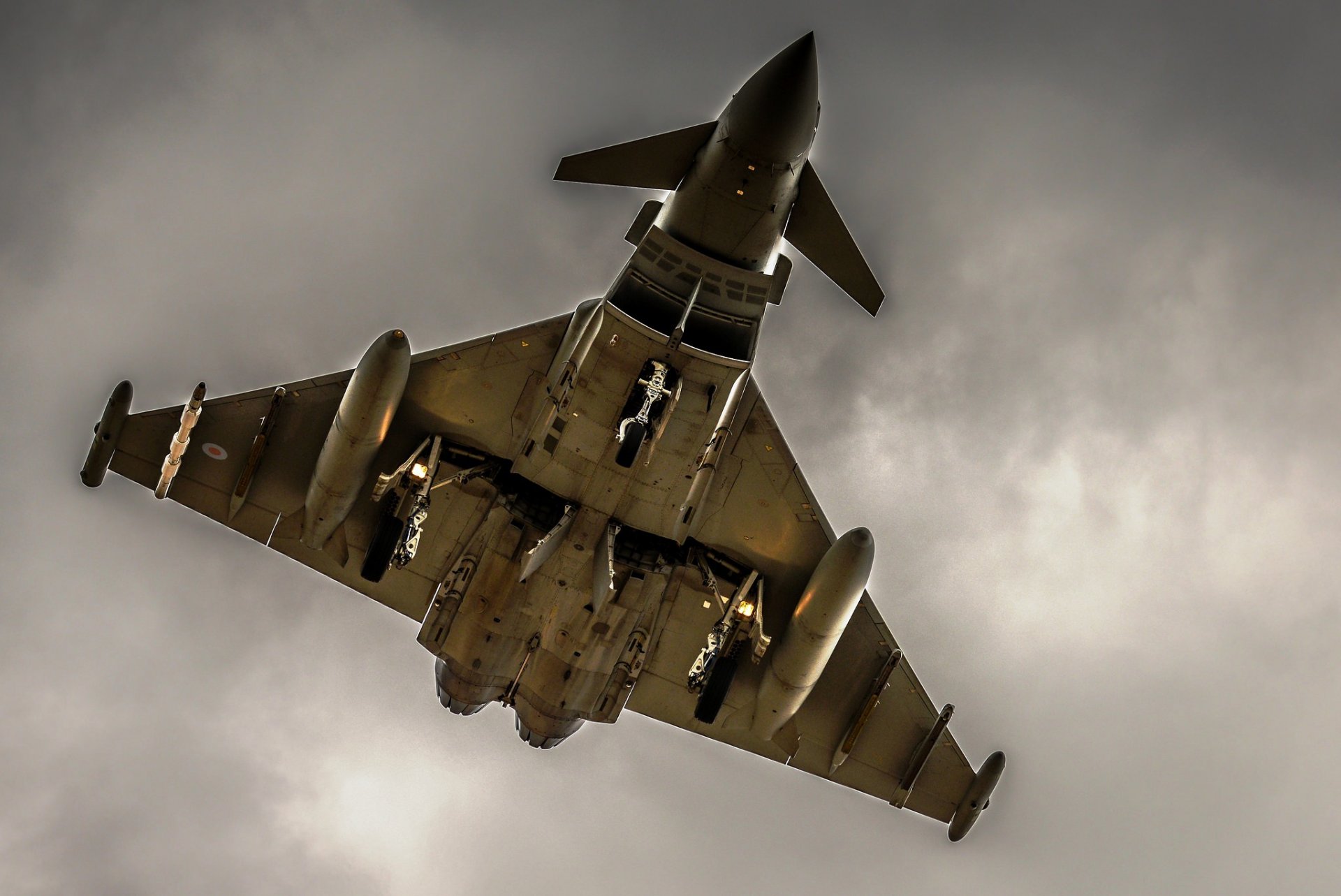 Un chasseur entièrement activé vole dans un nuage de fuméeUn chasseur entièrement activé vole dans un nuage de fumée