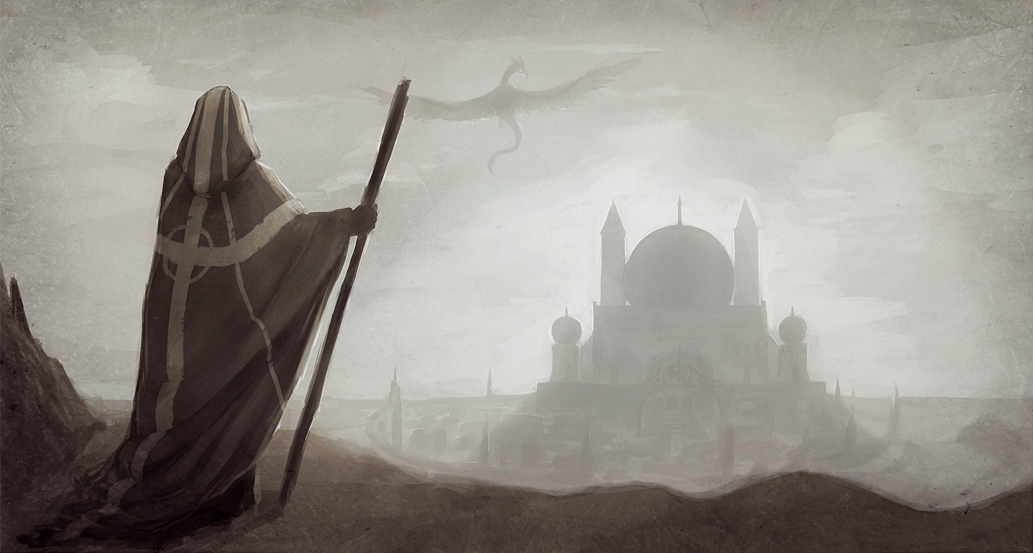 Un magicien avec un bâton observe le vol d'un dragon
