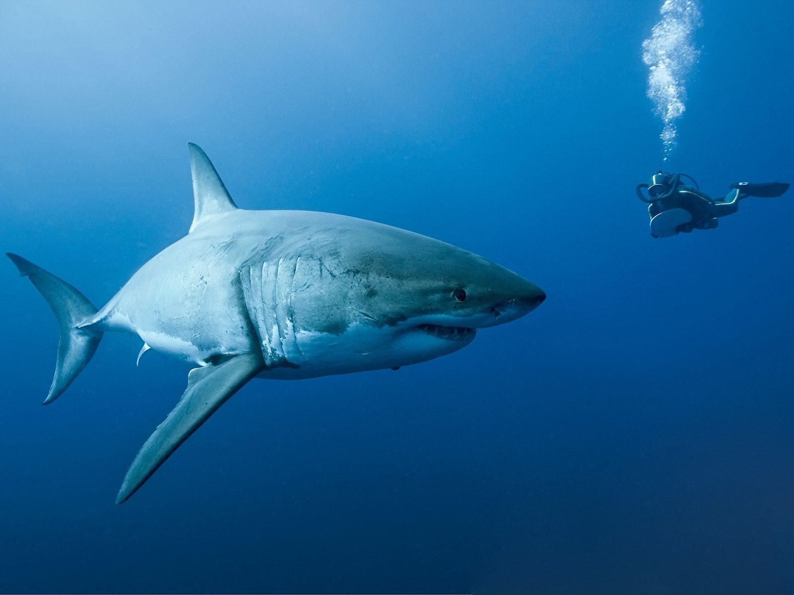 Requin sous l'eau dans l'océan en regardant un plongeurRequin sous l'eau dans l'océan en regardant un plongeur