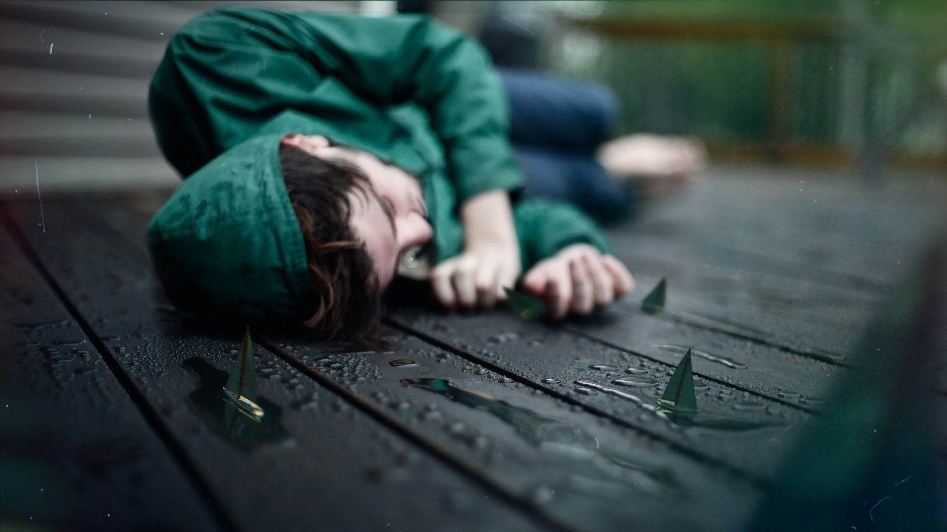 L'homme est couché sur le sol parmi les bateaux mouillésL'homme est couché sur le sol parmi les bateaux mouillés