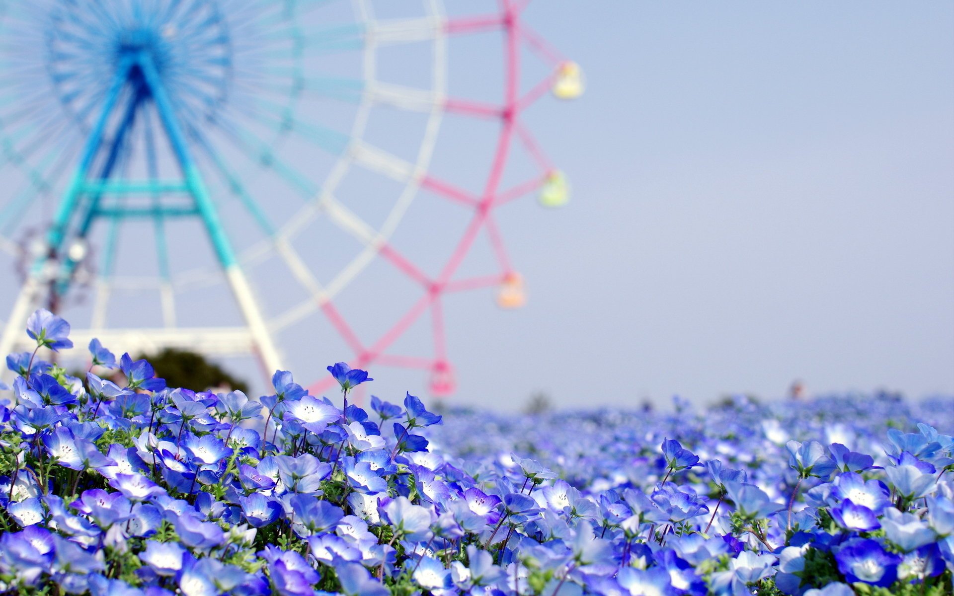 Délicates petites fleurs bleues sur fond de grande roue